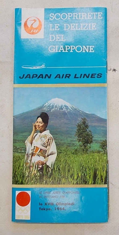 In 8° (cm. 23 x 10); pagg. 24 + 24; con carta delle rotte, carta del Giappone e pianta di Tokyo; numer. illustraz. fotograf. in nero e disegni in colore; copertina fotograf. a colori. VG. ** "Le linee aeree giapponesi vi invitano per la XVIII Olimpiadi Tokyo, 1964".