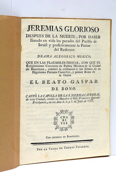 Jeremias Glorioso Despues de la muerte; por haber Llorado en vida los pecados del Pueblo de Israël y profeticamente la Pasion del Redentor. Drama alegorico musico, Que en las plausibles fiestas, con que el Religiosisimo Convento de Padres Minimos de la Ciudad de Barcelona, celebro´ la exâltacion a` los altares de su Dignisimo Prelado Correctór, y primer Beato de la Orden El Beato Gaspar de Bono. Cantó la capilla de la S. Iglesia Catedral de esta Ciudad, siendo su maestro el Rdo. Francisco Queralt Presbytero, en los dias 5. 6. y 7. de Julio de 1787.