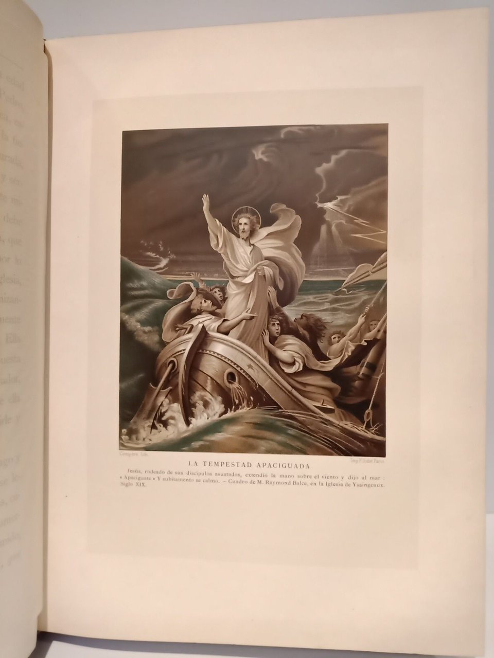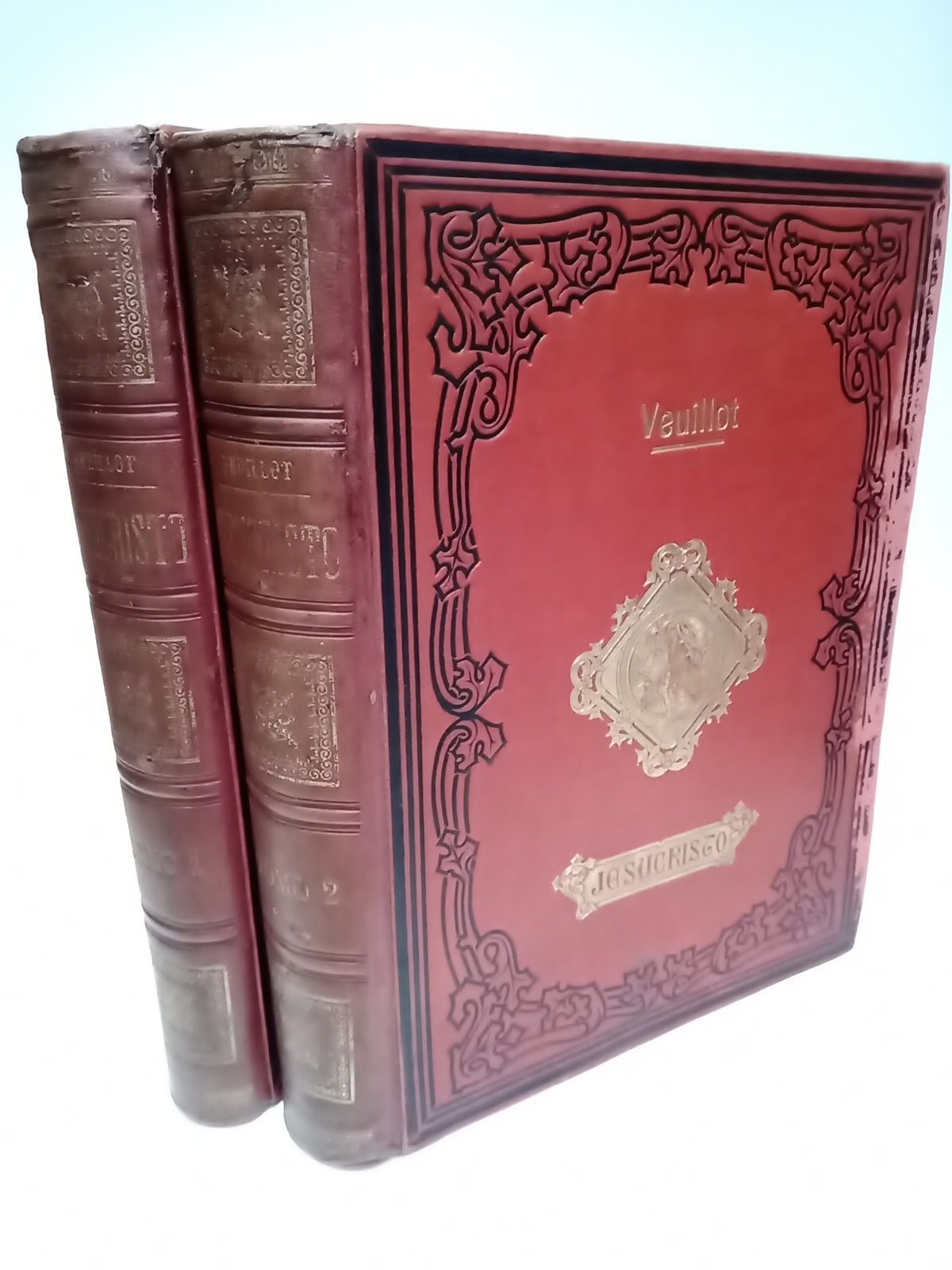 Nueva Edición.- Barcelona: Marcelino Bordoy y C.ª, [ca. 1881].- 2 Vols. (XXIII,493; 495 pp.): Profusión de ilustraciones mostrando facsímiles de grabados antiguos, tanto entre el texto como a página completa, además de 18 preciosas cromolitografías protegidas por papel de seda y un grabado al acero desplegable en tres partes independientes; Folio mayor (31,5 x 24 cm); Enc. en Media Piel Ed., lomo cuajado, planos con estampaciones en negro y oro, guardas de moiré.* Encuadernaciones rozadas en los márgenes externos, con los lomos deslucidos y, en el caso del tomo 1, la cabeza desgajada. El tomo 2 tiene una mancha de humedad en el margen inferior externo de las primeras hojas, hasta la página 35. Las guardas y hojas adyacentes igualmente afectadas de humedad en el margen externo. A pesar de lo descrito, los libros se encuentran en estado aceptable, con las láminas en excelente estado. CRISTOLOGÍA-EVANGELIOS-NAVIDAD