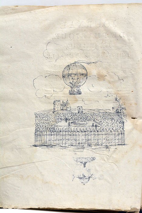 131 pages. 1 feuillet. (27x21 Cm). Broché. Couverture muette de l'époque. Ouvrage cassé en deux. Déchirures et manques de papier. Plis et traces de plis. Ce tome LXXXVII contient des réflexions autour de différentes sciences physiques: L'astronomie, la chimie et la géologie. On doit à Blainville, zoologiste et anatomiste français, la classification moderne de la classe des Mammifères partagée en trois sous-classes : les Monotrèmes, les Marsupiaux et les Placentaires. L'ouvrage est cassé en deux et porte plusieurs traces d'usures: travaux de vers, rousseurs, accrocs et mouillures claires. Plusieurs très beaux dessins de montgolfières dessinés par une main inconnue mais douée.
