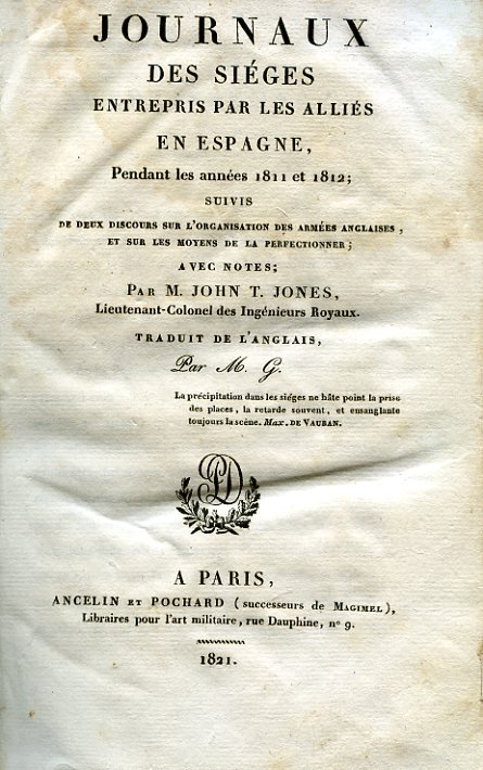 In-8° (202x125mm), pp. VIII, XVI, 464, legatura coeva m. pelle con filetti oro e titolo oro su tassello al dorso. Punte in pergamena, piatti marmorizzati. 9 grandi carte incise su rame e ripiegate f.t. in fine di battaglie della Guerra d'Indipendenza Spagnola (Peninsular War per i britannici). Esemplare lievemente imbarcato, con alcune fioriture e aloni interni. Prima edizione francese di questo resoconto degli eventi bellici della Guerra d'indipendenza spagnola nel biennio 1811-'12, steso dal Luogotenente-Colonnello Jones dell'esercito britannico. L'edizione originale (Journals of the Sieges undertaken by the Allies in Spain in the Years 1811 and 1812) era uscita a Londra nel 1814. 'L'auteur a servi comme officier du génie lors des sièges qu'il relate. Il publie cet ouvrage pour analyser les motifs qui ont amené l'échec de ces différents sièges'. (Tulard). La Guerra d'indipendenza spagnola narrata nella presente opera fu il più grande conflitto delle guerre napoleoniche, combattuto nella penisola iberica da una alleanza di Spagna, Portogallo e Regno Unito contro il Primo Impero francese. La guerra ebbe inizio quando l'esercito francese occupò la Spagna nel 1808 e terminò nel 1814 con la sconfitta delle truppe napoleoniche ma con il totale dissesto dell'economia di Spagna e Portogallo, crisi che portò ad un periodo di guerre civili fra liberalismo ed assolutismo protrattosi fino al 1850 e all'indipendenza dalla Spagna delle antiche Colonie spagnole d'America e del Brasile dal Portogallo. Tulard, 744.