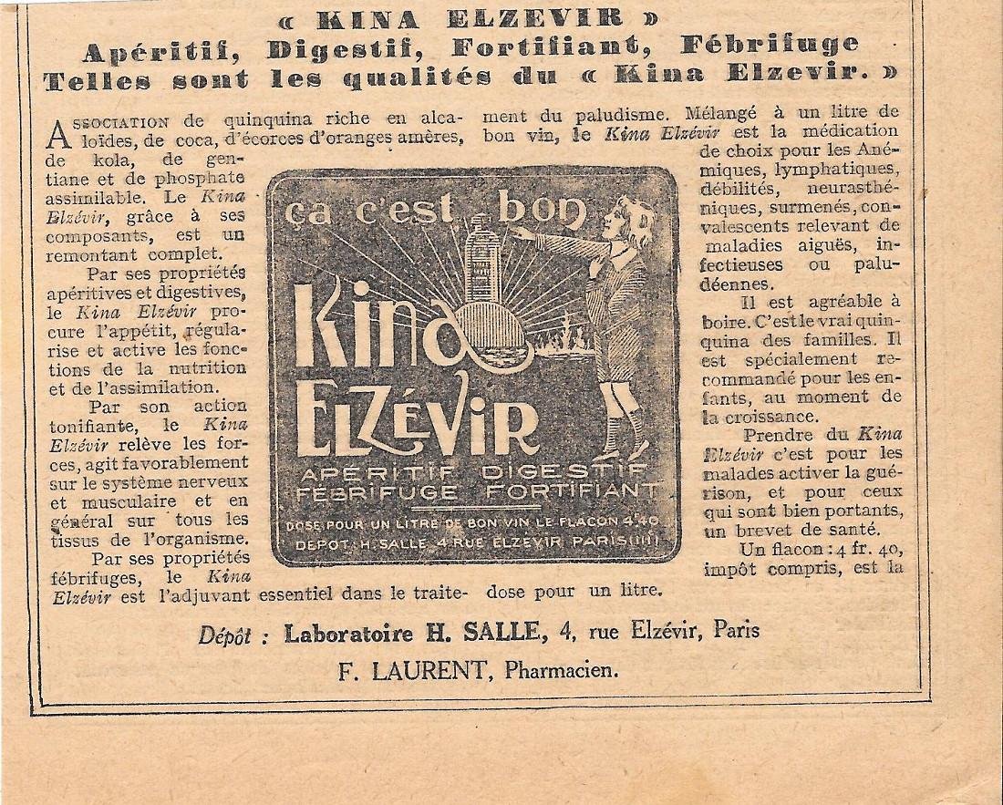 Kina Elzevir. Laboratoire H. Salle, Paris. Pubblicita 1930