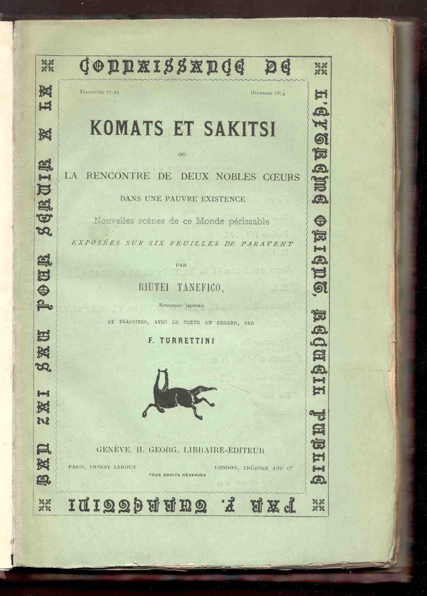 Komats et Sakitsi ou La rencontre de deux nobles coeurs dans une pauvre existence. Nouvelles scènes de ce monde périssable exposées sur six feuilles de paravent. Traduites, avec le texte en regard, par François Turrettini