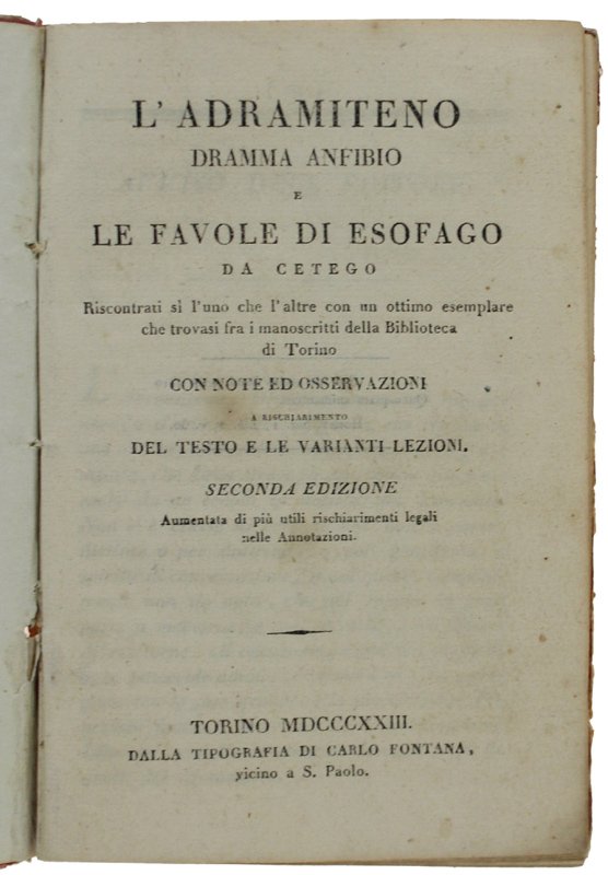 L'ADRAMITENO DRAMMA ANFIBIO e LE FAVOLE DI ESOFAGO DA CETEGO . con note e osservazioni a rischiarimento del testo e le varianti lezioni.