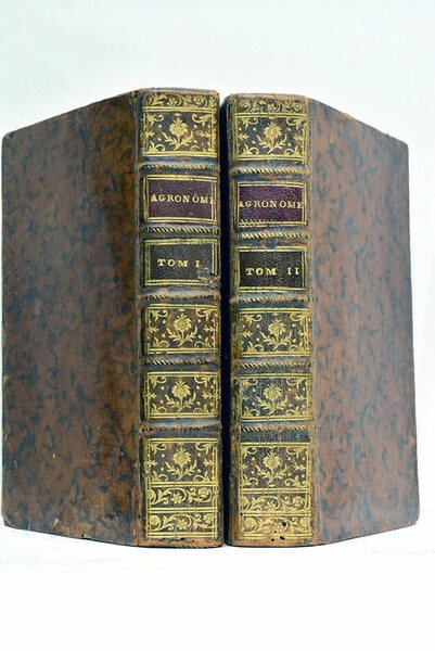 2 volumes. 2 feuillets. XIV. 1 feuillet. 472 pages. + 2 feuillets. 464 pages. (18,5x11,5 Cm). Veau marbré. Dos à nerfs orné. Reliure de l'époque. Petite réparation au dos d'un volume. Coins et coiffes émoussés. Charnières frottées. Cette "Maison Rustique" sous forme de dictionnaire avait été imprimée pour la première fois en 1760. Elle connut un grand succès et les rééditions se poursuivirent jusqu'au XIXe. Important chapitre sur le vin et le viniculture. Très bon exemplaire.