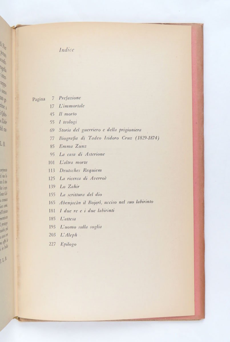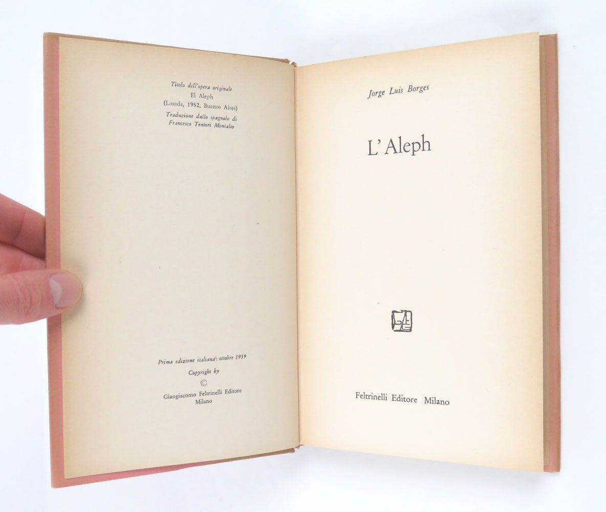 LIBROPrima edizione italiana.Ottimo esemplare (dorso della sovracoperta brunito e con un principio di fessurazione appena percettibile dovuto allo spessore del cartoncino, poco flessibile).Celebre raccolta di racconti, probabilmente il libro più famoso di Jorge Louis Borges, da tempo entrato nel canone dei classici contemporanei. «Per molti lettori degli ultimi decenni “L’Aleph” è il libro dove scoprirono non solo un nuovo grande scrittore ma un nuovo modo di essere della letteratura. Fu una specie di folgorazione, che poi si trasmise al resto dell’opera di Borges. Intanto, i titoli di alcuni di questi racconti — dallo “Zahir” a “Deutsches Requiem”, dalla “Ricerca di Averroè” all’“Immortale” — entravano nella nostra geografia mentale come luoghi da sempre familiari e misteriosi, per non uscirne più» (strillo dell’edizione moderna nel catalogo Adelphi). Uscì nel 1952 a Buenos Aires e qui compare per la prima volta in italiano grazie al lavoro di traduzione di Francesco Montalto. Fu il terzo libro “clamoroso” pubblicato da Feltrinelli, dopo «Il dottor Živago» (1957) e «Il Gattopardo» (1958).