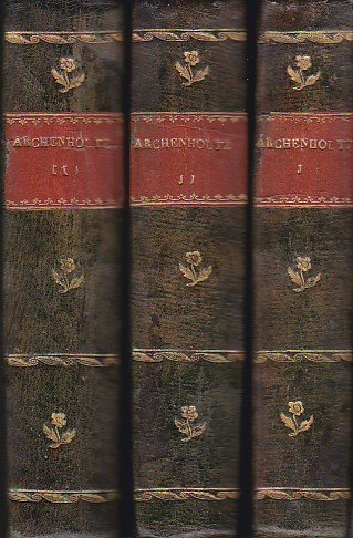 3 voll. in-8° antico (170x97mm), pp. (2), 429; (2), 490, (2); (2), 547; legatura dell'epoca m. pelle verde oliva con titolo e segnatura di volume in oro su tassello in pelle rossa ai dorsi, adorni di filetti, fiorellini e fregi floreali in oro. Piatti cartonati in marmorizzatura verde pallido. Angoli in pergamena, tagli a spruzzo rossi, piccoli fregi in rame ai frontespizi. Testatine arabescate in rame. Bell'esemplare, salvo usuali bruniture e fioriture di scarsa entità. Prima traduzione francese di quest'opera dell'Archenholz (Langfuhr, presso Danzca, 1745-Oyendorf, presso Amburgo, 1812), dovuta a L. F. Koenig e riveduta da Lanteires. Essa consiste in un'ampia ricostruzione storica del colonialismo inglese nelle Indie, con acconti geografici ed etnografici sulla globalità del territorio indiano, e si fonda (traducendola spesso testualmente) sulla precedente inglese di Robert Orme (Anjengo, India, 1728-Ealing, 1801), 'A History of the Military Transactions of the British Nation in Indostan from 1745', edita tra il 1763 e il 1778. L'Archenholz, fecondo scrittore politico e pubblicista di tendenze marcatamente anglofile (tendenze che a pieno si rispecchiano anche nella presente opera), fu ufficiale dell'esercito di Federico il Grande di Prussia dal 1759 al 1763. Dopo svariati viaggi attraverso l'Europa, e un decennale soggiorno in Inghilterra (1769-1779), attese quasi esclusivamente alla stesura delle proprie scritture storico-politiche, la prima delle quali, 'England und Italien', fu letta e stimata dallo stesso Goethe. Allo svilimento dei caratteri nazionali e delle istituzioni degli stati italiani, corrispondeva in essa la speculare esaltazione della legislazione, del governo e dello stile di vita britannico. Nel 1791 si trasferì a Parigi, contagiato dall'entusiasmo per la Rivoluzione Francese, facendosi appassionato difensore della carta costituzionale dello stesso anno. Fuggito poi in Germania, si stabilì definitivamente nei pressi di Amburgo, senza però cessare la sua attività di pubblicista sulla Rivoluzione, favorevole a Lafayette e duramente avversa agli eccessi giacobini del Terrore. Fra le sue molte opere, figurano volumi sulla storia inglese (Annalen der britischen Geschichte) e su quella Francese, sulla Guerra dei Sette Anni (cui aveva preso parte in prima persona), su Gustavo Vasa di Svezia. Dal 1792 al 1812 diresse inoltre il periodico 'MInerva', destinato a larga risonanza in tutta Europa. Eyriès in Michaud, Biogr. Universelle, XXXII, 144-145 (voce 'Robert Orme'). Cfr. F. G. Ruof, J. W. A., Berlino, 1915 e la voce 'Archenholz' di Karl Schottenloher in Encicl. Italiana, IV, 26. Inoltre: Meerheimb in NDB, I, 335 e sgg. Emil Dovifat in ADB, I, 511-512.