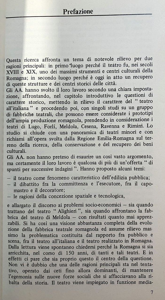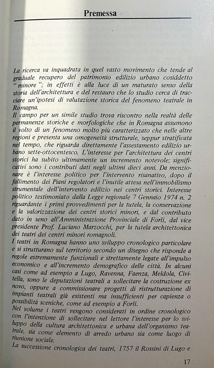 La ricerca va inquadrata in quel vasto movimento che tende al graduale recupero del patrimonio edilizio urbano cosiddetto minore, é, in effetti, alla luce di un maturato senso della storia dell'architettura e del restauro che lo studio cerca di tracciare un'ipotesi di valutazione storica del fenomeno dell'architettura teatrale in Romagna. Il campo per un simile tentativo trova riscontro nella realtà delle permanenze storiche e morfologiche che in Romagna assumono il volto di un fenomeno molto più caratterizzato che nelle altre regioni e presenta una omogeneità strutturale, seppur stratificata nel tempo, che riguarda direttamente l'assestamento edilizio urbano sette-ottocentesco. I teatri in Romagna hanno uno sviluppo cronologico particolare e si strutturano sul territorio secondo un disegno che risponde a regole estremamente funzionali e strettamente legate all'impulso economico e all'incremento demografico delle città. La successione cronologica dei teatri, 1757 il Rossini di Lugo, 1857 il Comunale di Rimini racchiude un periodo storico fondamentale per quello che riguarda il volto dell'architettura, periodo che racchiuso nel corso di un secolo vede operanti nel territorio delle Legazioni i maggiori architetti neoclassici. È comunque alla luce delle recenti e più auspicabili direzioni di politica regionale: verso l'istituzione di un teatro regionale ed un organico piano normativo di tutela che lo studio trova un suo specifico ambito di riferimento. Essendo le fabbriche teatrali un bene inalienabile della collettività, la loro rivitalizzazione e recupero permetterà di disporre di specifiche strutture per il teatro regionale al fine di una capillare forma di promozione culturale ed artistica.