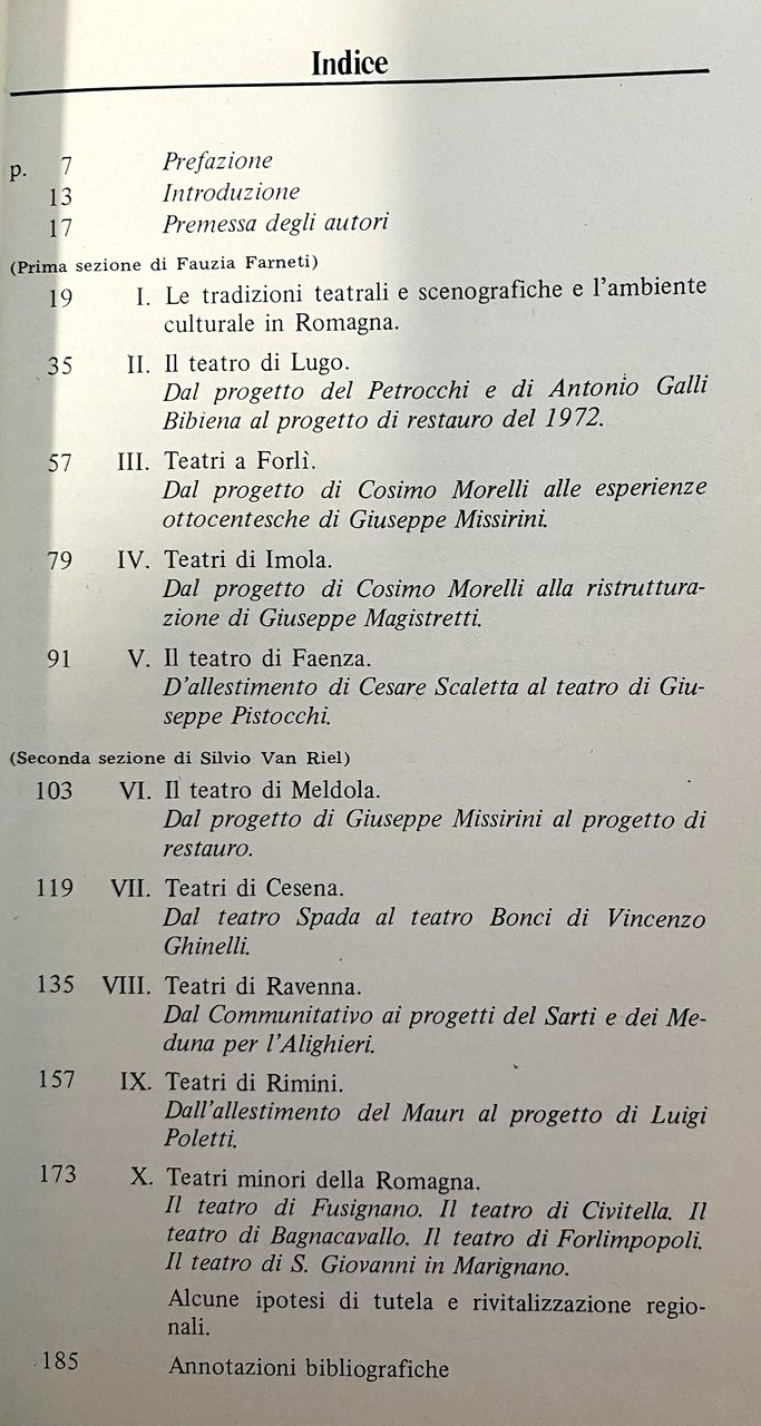 Soggetti: Urbanistica Ricerca Patrimonio edilizio urbano Storia dell'architettura teatrale Emilia Romagna Restauro Studi architettonici Stratificazioni Edilizia urbana Settecento Ottocento Teatri Territorio Città Teatro Comunale Rimini Legazioni Architetti neoclassici Politica regionale Riferimento Bibliografia Fabbriche teatrali Collettività Rivitalizzazione Recupero Promozione culturale artistica Didattica Monumenti Centri storici Produzione romagnola Lugo Forlì Meldola Cesena Ravenna Minori Conservazione Beni culturali Capo-mastro Maestranze Decoratori Decorazioni Concezione spaziale tecnologica Spazio Coro Lirica Pubblico Platea Acustica Problemi socio-economici Alighieri Fabbrica Scena Borghesia Aristocrazia Tradizioni Scenografiche Ambiente Petrocchi Antonio Galli Bibiena Cosimo Morelli Giuseppe Missirini Imola Ristrutturazione Giuseppe Magistretti Faenza Allestimento Cesare Scaletta Pistocchi Progetti Spada Bonci Vincenzo Ghinelli Communitativo Sarti Meduna Mauri Luigi Poletti Fusignano Civitella Bagnacavallo S. Giovanni in Marignano Tutela Antichità Artigianato Barocco Stili Bidente Savio Scalpellini Neoclassicismo Annotazioni bibliografiche Archivio di Stato Carteggi Atti Documenti Deputazioni Algarotti ANDREINI Memorie cesenati BORSIERI Annali FIANDRINI Ravennati GAMBA De facti LAURENTI Cronache fusignanesi LUGARESI Cronaca TORRICELLI Memoriali Meldolesi ADEMOLLO Fasti Pergola Firenze Pittura Musica BALDINUCCI Disegno BECQ DE FOUGINERES Mise en scène CAMPORI CAPUCCI LENZINI Rossini CAROZZI MIONI Italia CASADEI Feste Apparati medicei CELLER Costumes CRESTI D'ANCONA Sacre rappresentazioni EZZI AGIOLOERRARI Scenografia REGNA Forma ALLI Studenti Zaccaria Tonini Santi Rossi Rivalta Ricci Placci Pinelli Pasolini Zanelli Lanzoni Lavagnino Mariani Milani Milizia Morandi Morini Fregna Dezzi Bardeschi Fagiolo Griseri Gabetti Gurrieri Landriani Libri illustrati rari fuori catalogo Saggi Edifici Spettacoli Attori Sport Intrattenimento Tempo libero Società Filosofia Spazi Ricreativi Arene pubbliche Platee Bagnocavallo Urban Planning Research Building Heritage History Architecture Restoration Architectural Studies Stratifications Construction Eighteenth Century Nineteenth Theatres Territory City Municipal Legations Neoclassical Architects Regional Politics Reference Bibliography Factories Community Revitalization Recovery Cultural Artistic Promotion Education Monuments Historic Centers Production Minors Conservation Master Builders Craftsmen Decorators Decorations Spatial and Technological Concept Space Chorus Audience Stalls Acoustics Socio-economic Problems Factory Stage Bourgeoisie Aristocracy Traditions Scenographic Environment Renovation Installation Projects Protection Antiquities Craftsmanship Baroque Styles Stonemasons Neoclassicism Bibliographic Notes State Archives Correspondence Acts Documents Deputations Memories Annals Chronicles News Memorials Feasts Florence Painting Music Drawing Italy Celebrations Medici Apparatus Sacred Performances Scenography Students Rare Illustrated Books Out of Print Essays Buildings Shows Actors Entertainment Free Time Society Philosophy Recreational Spaces Public Arenas