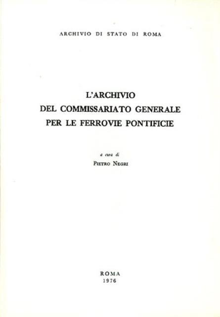 86 p. ; 24 x 17 cm. Quaderni della "Rassegna degli archivi di Stato". Il fondo documentario descritto in questo volume è conservato nell'Archivio di Stato di Roma ed è costituito dall'archivio del Commissario generale per le ferrovie pontificie, che fu creato nel 1858 quale organo competente del controllo amministrativo e tecnico sulle ferrovie nel territorio della Chiesa. Brossura editoriale, copertina in cartoncino flessibile di colore celeste, con titolo impresso al piatto e al dorso. Codice libreria 4254.