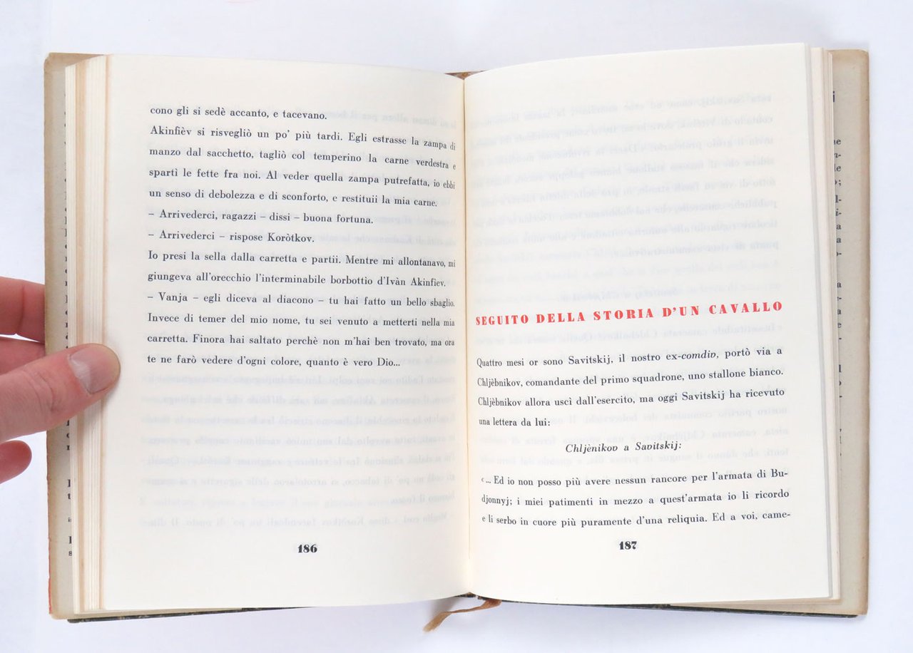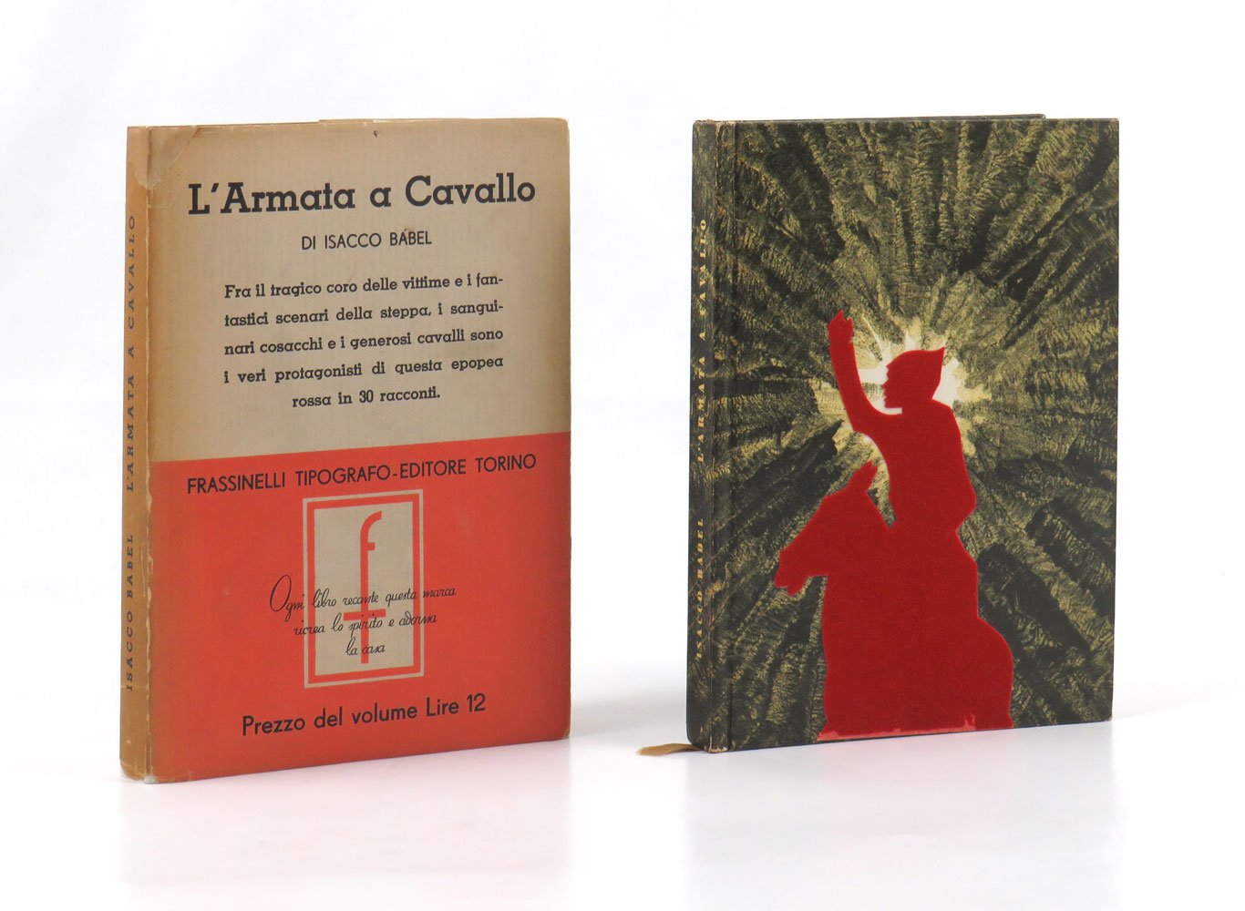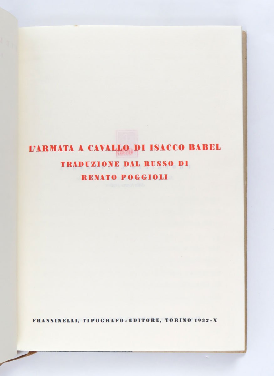LIBROPrima edizione italiana.Più che buon esemplare, quasi ottimo, completo della rara sovracoperta (localizzato restauro integrativo alla testa della sovracoperta in prossimità del dorso, volto a sanare una veniale mancanza), minimi e leggeri segni del tempo qua e là, parziale sbiaditura alla sagoma di copertina in panno Lenci.Mitico primo titolo della «Biblioteca europea» diretta da Antonicelli e meravigliosamente disegnata e stampata da Carlo Frassinelli, il geniale tipografo ed editore sperimentale in grado di costruire un catalogo ineguagliato sia per qualità fisiche dei libri che per contenuti. Come annuncia il motto stampato sopra la marca editoriale «F» sulla sovracoperta, «Ogni libro recante questa marca ricrea lo spirito e adorna la casa»: la cura del prodotto-libro è infatti totale in ogni aspetto, dai contenuti fino alla copertina d’artista protetta dalla sovracoperta, passando per la sottile e bianchissima carta e il segnalibro in seta. -- Per «L’armata a cavallo» il pittore Mario Sturani inventa una sagoma di cosacco in rosso panno Lenci che viene applicata al piatto superiore sullo sfondo di una carta stampata a motivo xilografico in stile violentemente espressionista: dettaglio, questo, che rende la prima edizione del libro un vero e proprio esperimento artistico.