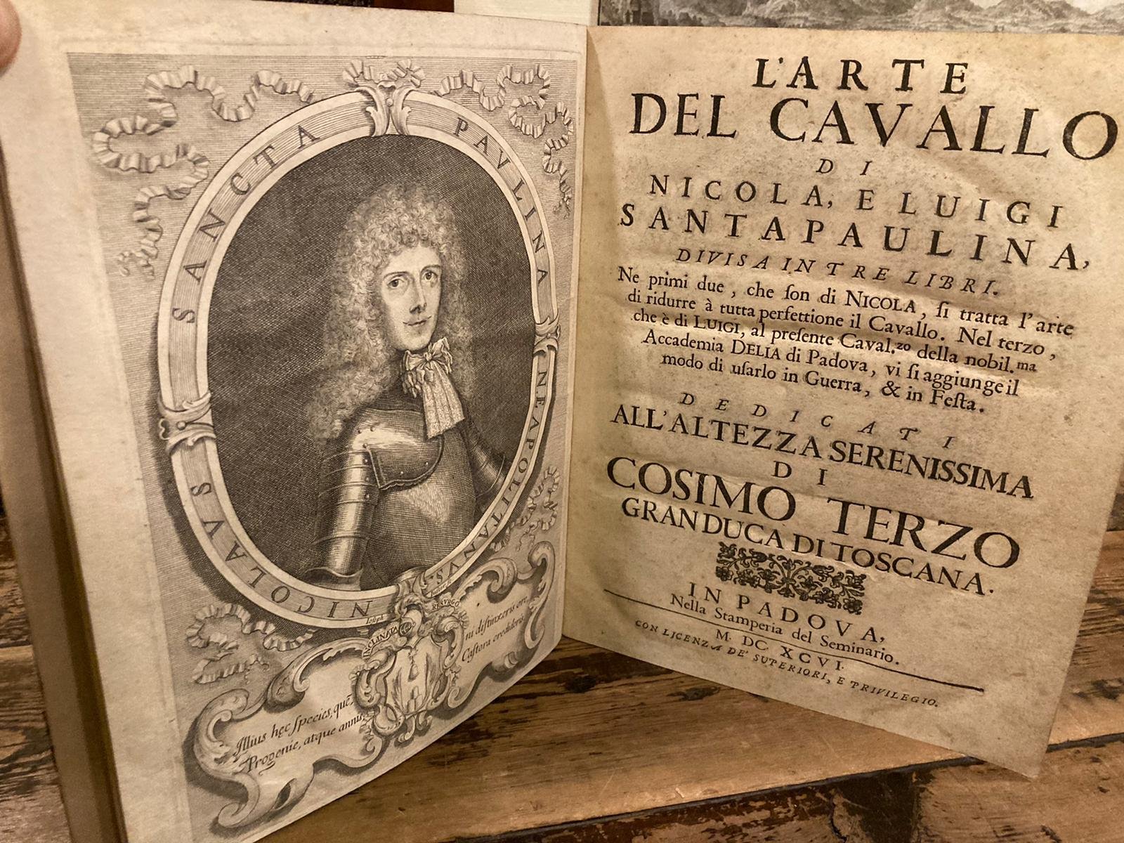 In-4° (250x200mm); pp. (12), 208, legatura posteriore in mezza tela verde con titolo in oro al dorso. Antiporta incisa su rame dal Luster con ritratto dell'autore a mezzo busto entro cornice e suo blasone. Dedica a stampa a Cosimo III, Granduca di Toscana. Piccolo fregio floreale sul frontespizio; capilettera, testatine e finalini riccamente arabescati in xilografia; 10 diagrammi xilografici di esercizi di maneggio n.t. Buon esemplare, leggermente rifilato al momento della rilegatura primonovecentesca. Manca, come spesso in altri esemplari, l'antiporta figurata, Prima e unica edizione, di questo vasto trattato di ippologia ed equitazione dedicato al Granduca di Toscana Cosimo III da Luigi Santapaulina, che aveva raccolto e ordinato gli scritti del padre, pubblicandoli insieme con i propri. Graesse, VI, p. 268. Cat. Vinciana, 157. D'Ayala, p. 210. Olschki, 'Choix', 377 e 10156. S.T.C. Italian Books. XVII sec., 820. Michel-Michel, VII, 83. Cat. Cavalieri, 1514.