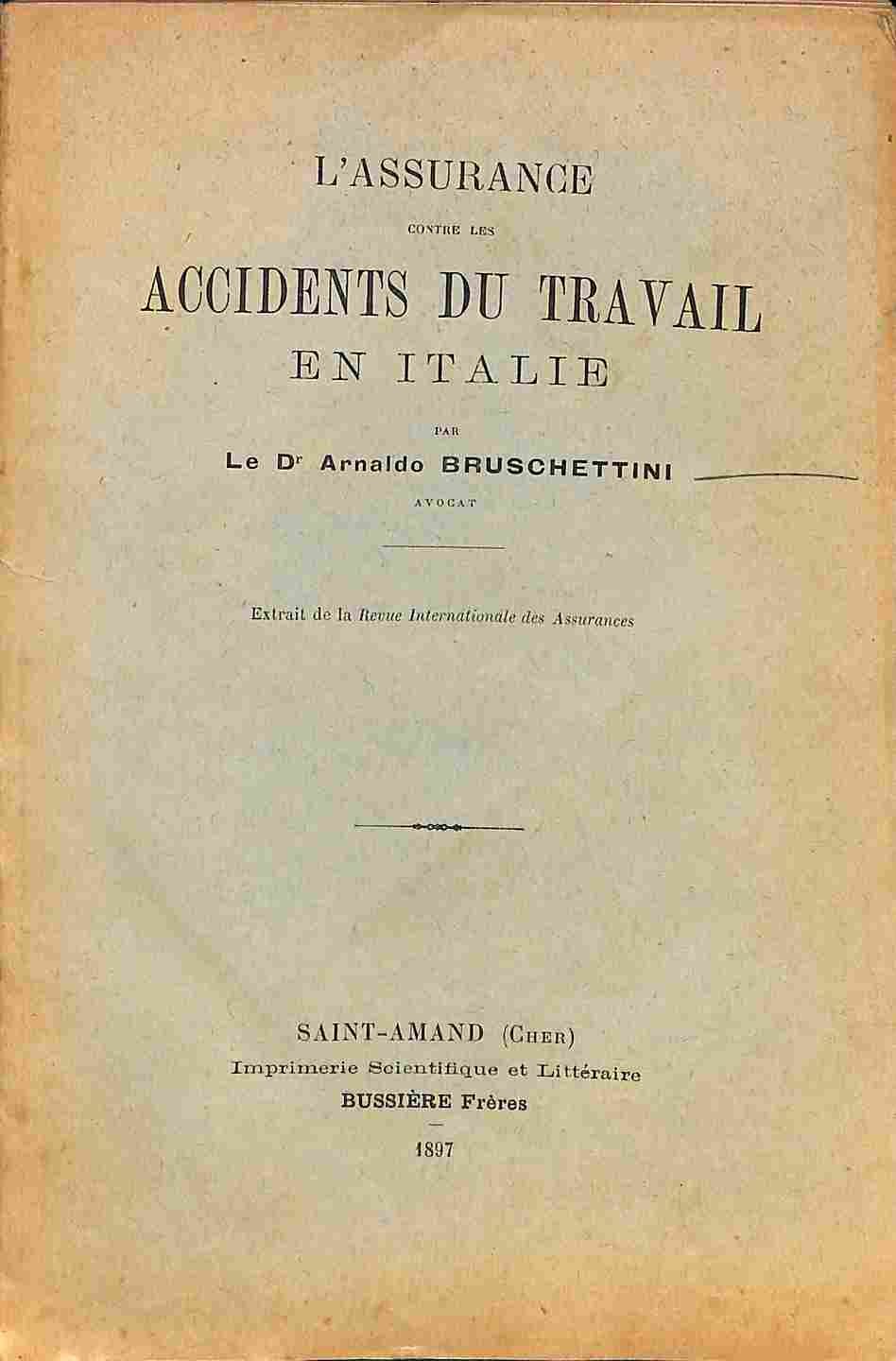 In 8 (cm 15,5 x 23,5), pp. 46 + (2). Brossura editoriale. Estratto editoriale da "La Revue Internationale des Assurances". Conservato all'interno il biglietto da visita dell'Autore Arnaldo Bruschettini, professore di diritto commerciale all'Universita' di Pisa. Saggio in lingua francese sull'assicurazione contro gli infortuni sul lavoro in Italia.