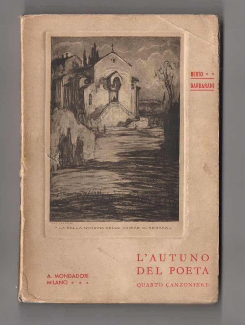 LIBRO Prima edizione. CON AUTOGRAFO. Più che buon esemplare (gora vistosa al piatto posteriore che prosegue sul dorso e sull’angolo basso del piatto anteriore; cerniere e dorso leggermente abrasi; piega al margine alto del piatto anteriore; piccola traccia d’urto al piatto anteriore e alle prima carte; internamente ottimo, fresco e pulito). Note a matita nel testo. Bella dedica autografa dell’autore a importante letterato triestino. Quarto e ultimo canzoniere di Barbarani, dal titolo significativo «L’autunno del poeta» (fu pubblicato quando il poeta aveva 64 anni), di ispirazione e tematiche sempre vicine ai primi tre canzonieri. Ultima raccolta di versi stampata vivente il poeta, che sarebbe morto poco dopo il bombardamento di Verona nel 1945.