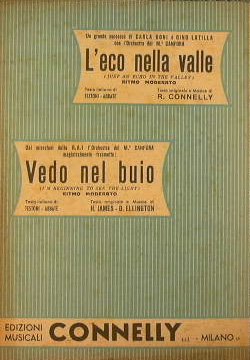 Autori: Testoni, Abbate, Connelly R., James H. e Ellington D. - Un grande successo di Carla Boni e Gino Latilla con l'Orchestra del Maestro Canfora - in 8° - pp.14 - Brossura editoriale - Partitura per Pianoforte, Violino/Fisarmonica, Saxofono Contralto, Saxofono Tenore, Tromba e Contrabbasso