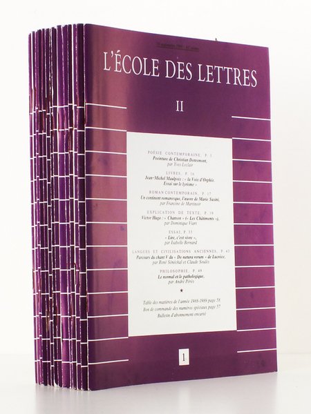 14 vol. in-8 br., couv. violette, L'école des lettres, Paris, 1989 et 1990, env. 900 pp. au total. Au sommaire notamment : la dissertation littéraire générale, théorie et pratique (n° 5 ) ; Zola et le naturalisme (in n° 6) . Très bon état. Prix pour l'ensemble.