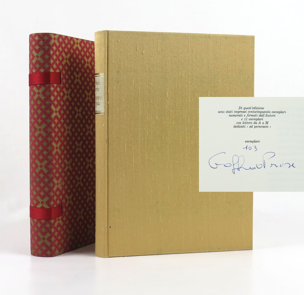 LIBROPrima edizione, tiratura di testa.CON AUTOGRAFO.Esemplare n. 103/150, in condizioni eccellenti, ben completo della firma autografa dell’autore al colophon.Splendida tiratura di lusso rilegata in seta e provvista di elegante astuccio, stampata in soli 150 esemplari numerati e firmati da Goffredo Parise al colophon (più 10 ad personam siglati in lettere). Diario di viaggio in Giappone, impaginato con rara ricchezza da Mondadori per la collana «Le Palme». Vinse il premio Comisso 1983.