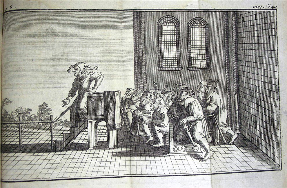 L’ELOGE DE LA FOLIE composé en forme de Déclamation par. et traduit par Mr. Geudeville. Avec les Notes de Gerard Listre & les belles figures de Holbein. Le tout sur l’Original de l’Academie de Bale. Piéce qui represente au naturel l’Homme tout défigure par la Sotise, lui aprend agréablement à rentrer dans le bon Sens & dans la Raison. Nouvelle edition.
