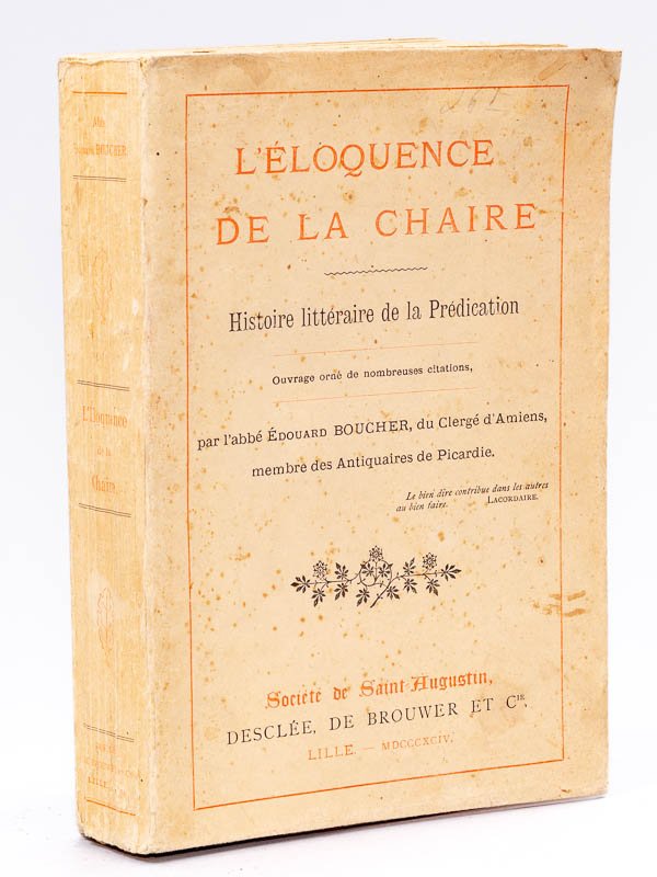 Ouvrage orné de nombreuses citations, 1 vol. fort in-8 br., Société de Saint-Augustin, Desclée, De Brouwer et Cie, Lille, 1894, 472 pp. Etat satisfaisant (couv. frottée, ancien cachet d'institution religieuse)