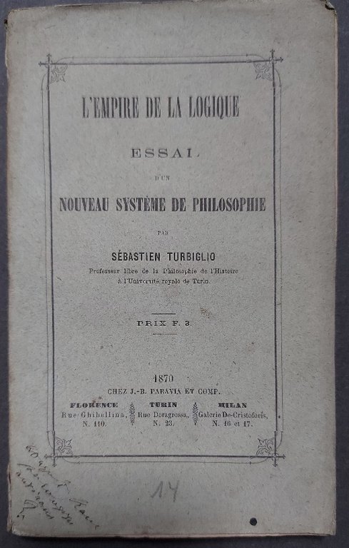 In 16 (cm 11,5 x 19), pp. 170 + (2 bianche). pagine intonse. Brossura editoriale (alcune annotazioni manoscritte al piatto anteriore). La data di stampa e' 1869 al frontespizio, 1870 al piatto anteriore. Edizione originale pubblicata in francese a Torino di quest'opera filosofica di Sebastiano Turbiglio. Tenne a Roma la cattedra di Storia della filosofia sino alla morte di Luigi Ferri, dopodiche' successe proprio a Ferri e ricopri' la cattedra di filosofia teoretica, materia su cui non pubblico' un'ampia bibliografia eccezion fatta proprio per questo saggio del 1869.