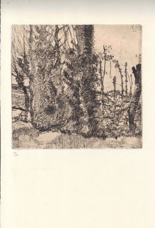Cartella In-folio (cm 45 x 30), contenente 8 bifolii sciolti (il primo e l'ultimo fermati ai piatti della cartella), conil testo e le incisioni. Edizione in cento copie numerate - la ns. è una delle settanta in numeri arabi - impresse su carta a mano Fabriano. Al colophon si legge, tra l'altro: 'Le acqueforti, non essendo state firmate per la morte dell'Artista, vengono autenticate con il timbro a secco di Luigi Bartolini e dalla firma della figlia Luciana.' Nessuna copia attualmente in vendita. Ottimo esemplare. 'Poesie postume. Piuttosto raro e ricercato, con quotazioni vicine ai 2000 euro' (Gambetti - Vezzosi, p. 75).