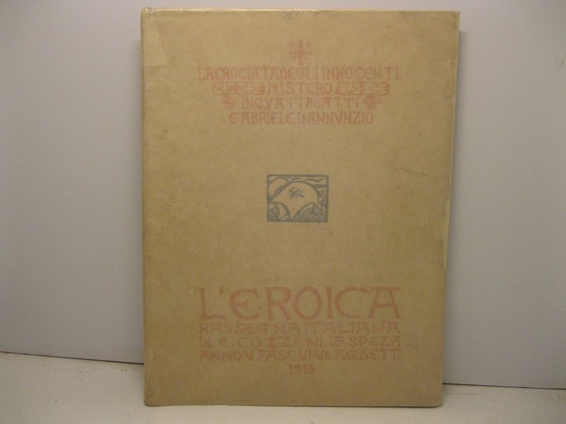 In 4, pp. 96 - 186 + (8) di pubbl. editoriale ornata splendide xilografie, con 5 grandi xil. e decine di testatine finalini sempre xil. tutti opera di Emilio Mantelli, celebre xilografo legato all'Eroica sin dai suoi esordi, mori' nel 1918 per cause di guerra. Questo numero contiene l'opera teatrale d'annunziana La crociata degli innocenti., qui in edizione preoriginale. Br. ed. Comanducci, III, p. 1082. L'Eroica, 1983, p. 91