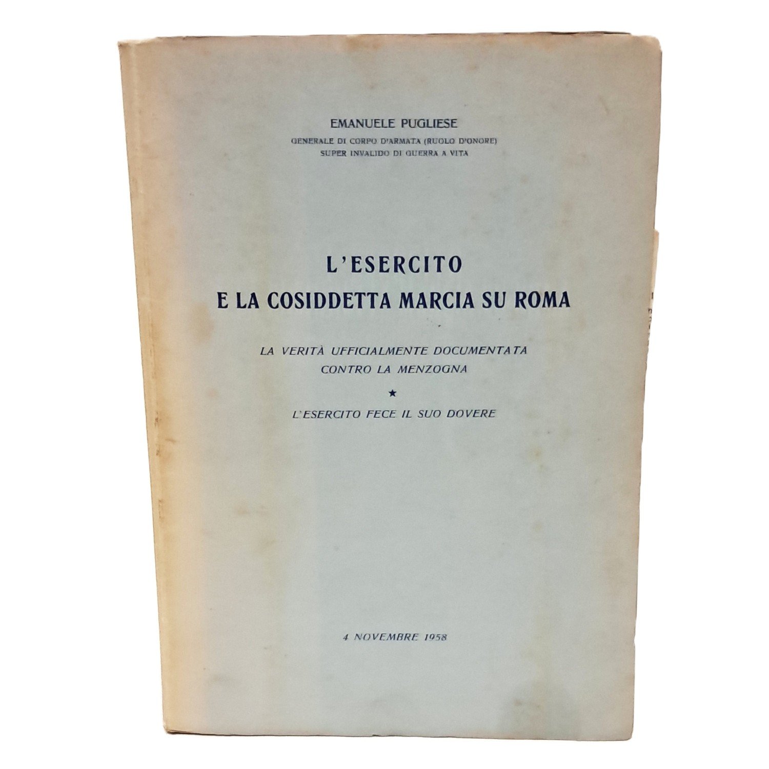 PRIMA EDIZIONE edito dall'autore con la dedica autografa dell'autore Emanuele Pugliese (Vercelli, 11 aprile 1874 – Roma, 26 settembre 1967) è stato un generale italiano di religione ebraica, particolarmente distintosi nella guerra italo-turca e nella prima guerra mondiale. Decorato con la medaglia d'argento al valor militare e con la Croce di Commendatore dell'Ordine militare di Savoia, fu comandante della 16ª Divisione durante i giorni della Marcia su Roma. Dopo la fine della seconda guerra mondiale fu protagonista di un'aspra diatriba con l'allora Ministro Emilio Lussu che nel suo libro Marcia su Roma e dintorni lo accusava apertamente di essere responsabile della mancata difesa della Capitale, non avendo impedito con le armi l'arrivo delle colonne di miliziani fascisti. Dopo la fine della seconda guerra mondiale fu edito il volume di Emilio Lussu Marcia su Roma e dintorni che era stato edito per la prima volta a Parigi nel 1933, e fino ad allora mai pubblicato in Italia. In questo libro Lussu lo accusava apertamente di connivenza con il regime fascista in quanto non si era opposto con le armi alla marcia su Roma delle colonne fasciste, e aveva addirittura omaggiato Benito Mussolini il giorno in cui era stato formato il suo primo governo. La sua reazione fu furibonda, arrivando al punto di sfidare apertamente Lussu, che allora ricopriva l'incarico di Ministro, a duello inviandogli i suoi padrini. Lussu rispose negativamente e il 6 luglio pubblicò sul quotidiano Il Momento un articolo intitolato Il Generale Pugliese dovrebbe essere fucilato. La sua replica non si fece attendere e nel 1946 diede alle stampe un primo libro intitolato Io difendo l'esercito, successivamente ripubblicato. in risposta ai nuovi attacchi di Lussu, in edizione ampliata e riveduta nel 1958 con il titolo di L'esercito e la cosiddetta "marcia su Roma". La verità ufficialmente documentata contro la menzogna. L'esercito fece il suo dovere. La polemica con Lussu si chiuse solo il 20 gennaio 1961, quando quest'ultimo dichiarò: Lealmente devo dire oggi, dopo approfondite indagini, che il generale non ha fatto che obbedire disciplinatamente ad ordini ricevuti e non era affatto in combutta col fascismo. Brossura. Pp. 126. Buone condizioni.