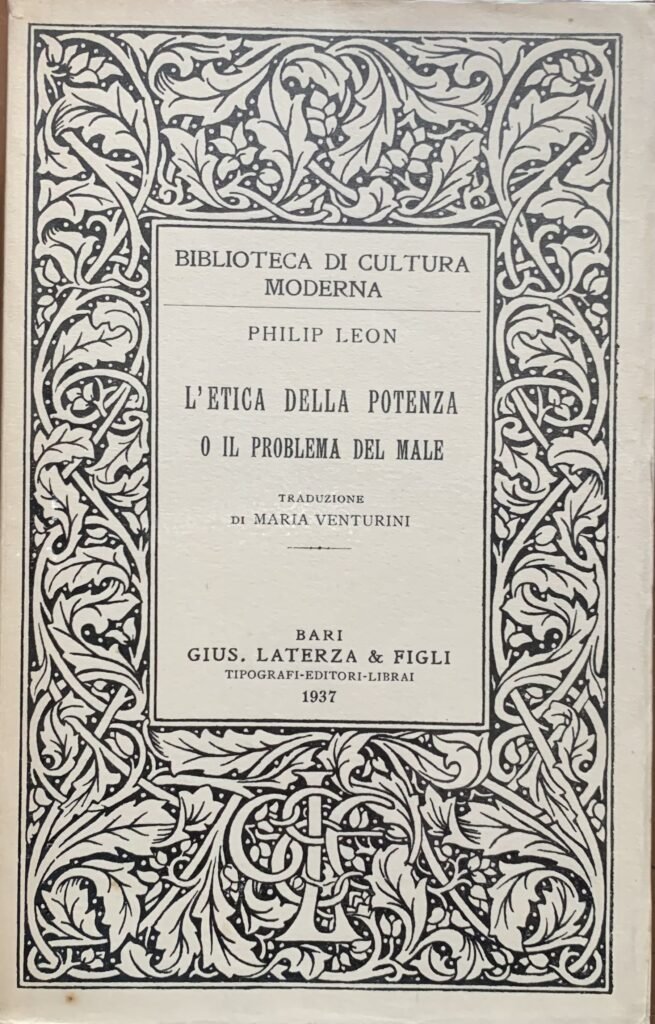 Philip Leon. L'etica della potenza o Il problema del male. Collana Biblioteca di Cultura Moderna n° 296. Laterza Bari, 1937. Brossura illustrata. Pagine 418. Dimensioni cm. 13 x 20,5. 1^ edizione. Traduzione di Maria Venturi. Esemplare in buonissime condizioni.