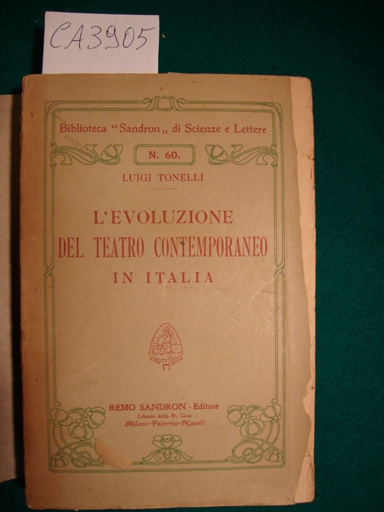 (Collana : Biblioteca - Sandron - di Scienze e Lettere - n. 60) Opera che delinea con la vivezza e chiarezza maggiore, la storia del teatro italiano, dalla proclamazione del Regno d'Italia, all'incirca, fino ai giorni della pubblicazione - DETTAGLIO DELLE CONDIZIONI : Parzialmente intonso, danni al dorso con legatura danneggiata e volume spaccato, minute fioriture ai piatti, taglio con carenza marginale al piatto anteriore. - (26d).