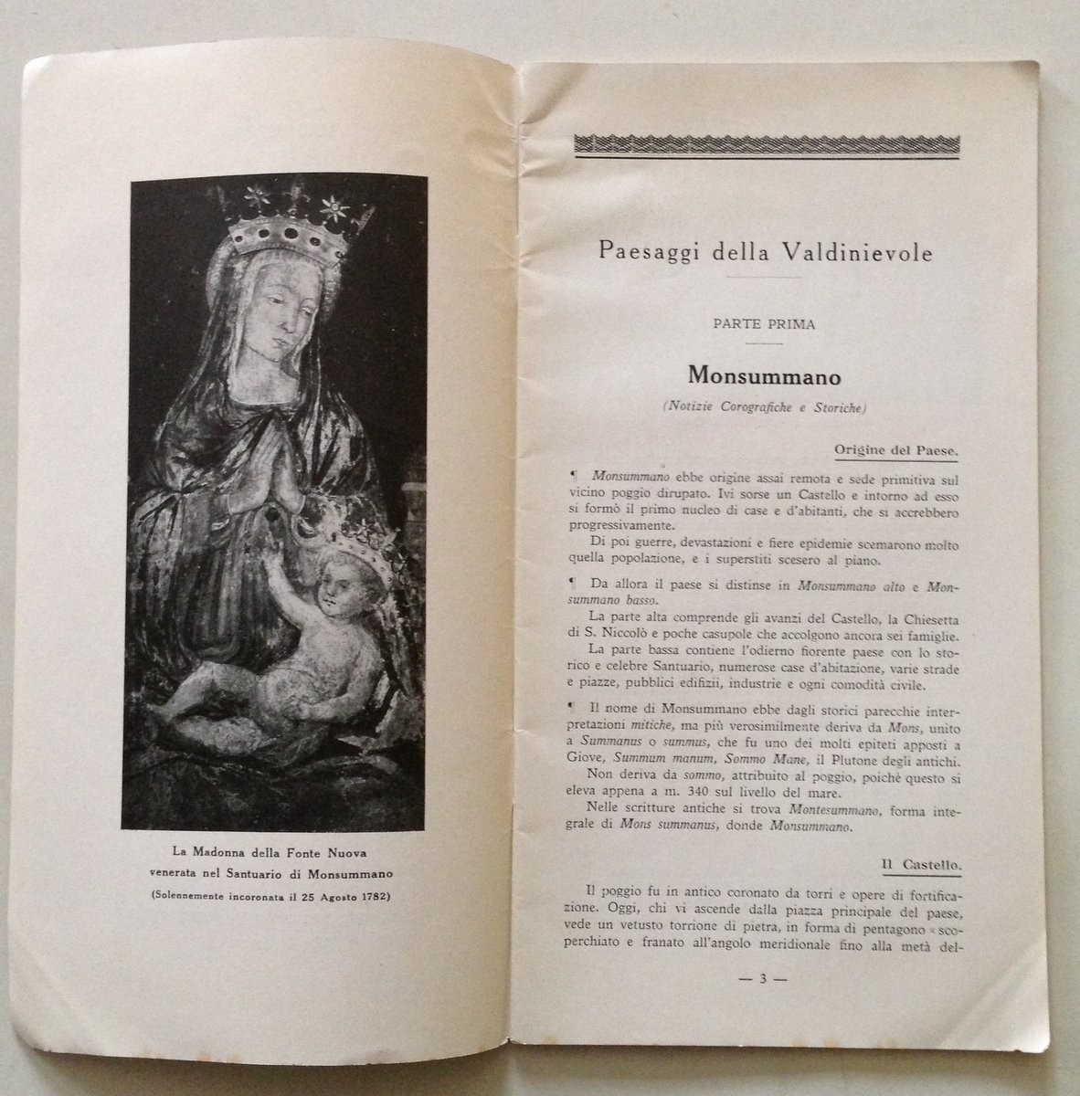 L. Gravina, Monsummano Casa Editrice L. Gravina, Firenze, 1941; cm 23x12; pp. 24; con ill. in b/n n.t. e a p. pag.; Monsummano, il paese, il castello, lo storico Santuario di N. S. della Fonte Nuova, la Grotta Giusti, le terme parlanti; br. ed. fig. Condizioni di conservazione Esemplare in buono stato con leggere tracce d'uso e del tempo; solo brossura editoriale con minime tracce di sporco. OPEB.4612 MT