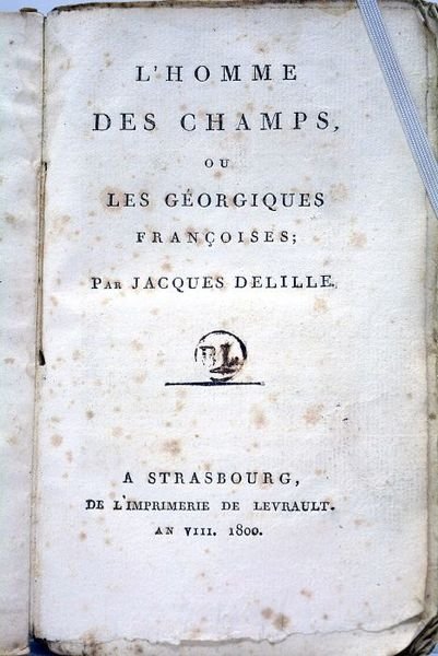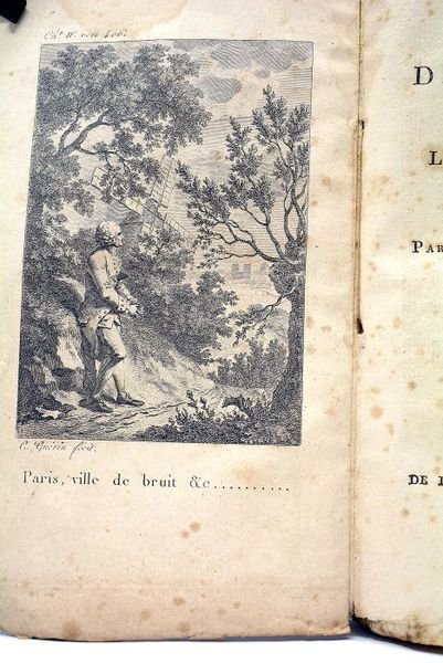 in-12. Frontispice. 2 feuillets. XXVI. 239 pages. 2 feuillets arrachés (pages 217-220). (18x11,5cm). Broché. Couverture d'attente de papier. Non rogné. Couverture abîmée: déchirures, salissures, petits manques de papier. Rousseurs et taches. Rares feuillets brunis. Déchirures sans manque à deux feuillets. Edition originale. Orné d'un charmant frontispice gravé. En quatre chants en vers. Ce poème était l'une des oeuvres préférées de Napoléon. Delille y suggère un art des jardins plus proche de ce que pouvait faire les Anglais. Célébration de la nature. Exemplaire non rogné, dans son jus.