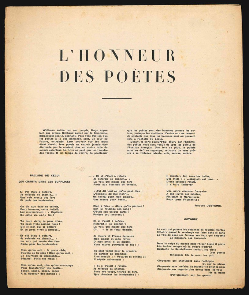 MANIFESTO Edizione originale. Ottimo esemplare (usura perimetrale con parziale distacco della cerniera tra prima e ultima carta; abrasione di pochi mm che tocca appena il testo al verso della prima carta). Volantino diffuso nell’estate del 1943 nella Francia occupata. Le poesie sono firmate dagli autori con i propri nomi da partigiani: Aragon (Jacques Destaing, François La Colère), Leiris (Hugo Vic), Hugnet (Malo Lebleu), Eluard (Jean Du Haut, Maurice Hervent), Tardieu (Daniel Trevoux), Lise Deharme (Cinq-Cygnes) etc. Pierre, Tracts surréalistes (Losfeld ed.), vol. II p. 315