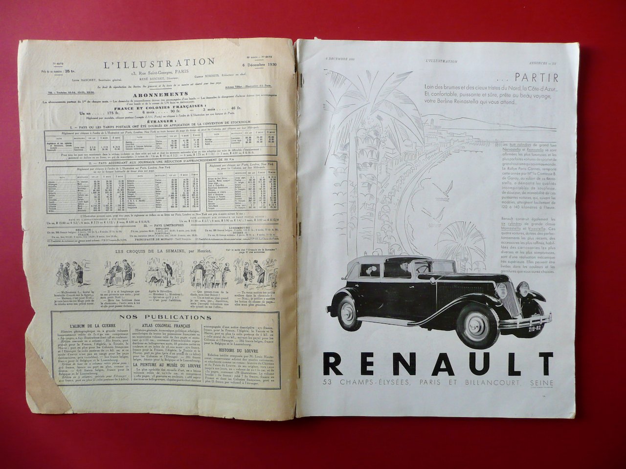 Rivista, L'Illustration" 6 Decembre 1930 - Numero speciale natalizio Paris 1930; cm 38x28,5; pp. LXIV (annunci commerciali); pp. non numerate (pp. 64), con numerosissime ill. a colori nel t. e fuori t., alcune delle quali applicate; anche qualche ill. in b/n. Brossura ed. (mancanza della brossura posteriore). Testo in francese. Condizioni di conservazione Esemplare complessivamente in buone condizioni con tracce d'uso, mancanza della brossura posteriore ma esemplare compatto, brossura ant. con alcune leggere bruniture e aloni, una piccola mancanza al margine esterno, angolo inferiore con strappetto restaurato al retro mediante l'applicazione di striscia cartacea; cuffie con piccole mancanze. Interni buoni con alcune piccole lievi bruniture e aloni. Presente un interessante articolo sull'evoluzione della legatura libraria, con illustrazioni a colori di eleganti legature (Legrain, Crettè, ecc.; vedi foto). Mancanza della brossura posteriore (vedi foto). Testo in francese. SETT175.L15769 N "