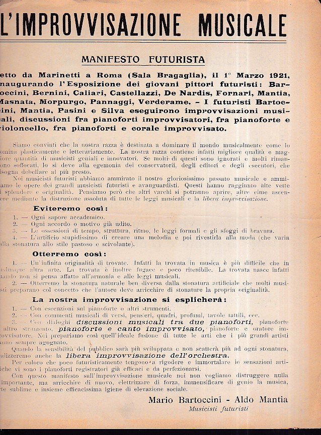 In-4°, pp. 4. Al retro viene pubblicizzata 'L'alcova d'acciaio' di Marinetti. Ottimo stato. Edizione originale. 'Pensiamo (.) che altri varchi si potranno aprire, altre cime ascendere mediante la distruzione assoluta di tutte le leggi musicali e la libera improvvisazione (.). Noi prepariamo cosi' quell'ideale fusione di tutte le arti che i più grandi artisti hanno sempre agognato'. Cammarota, Futurismo, Manifesti, 114. Salaris, p. 88a.