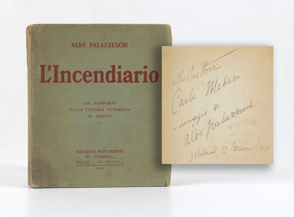 LIBROEdizione originale.CON AUTOGRAFO.Più che buon esemplare in brossura (segni del tempo perimetrali, particolarmente al dorso, interno lievemente brunito): la copia di Carlo Medici, il misterioso autore del romanzo horror «Gomoria», pregiata dalla dedica autografa dell’autore firmata «Milano, 12 marzo 1910».Importante raccolta di poesie, in parte inedite; compare qui, tra le altre, la famosa «E lasciatemi divertire». Apre il libro l’ampia prosa narrativa di Marinetti «Rapporto sulla vittoria futurista di Trieste» — che contiene a cornice anche il manifesto poi noto come «Discorso futurista ai triestini» (spesso erroneamente datato al 1909) — seguita dalla raccolta «Le fanfare della stampa. Il Futurismo e i Futuristi difesi da: Silvio Benco, Eda Gianelli, A. Bellotti, Paolo Arcari, A. Scocchi, V. Cuttin, Augusto Datta, G. Giacomelli, A. Tamanini», rassegna stampa ricca di interessanti contenuti. Pare che il libro sia stato messo al bando dalla censura austriaca nelle zone del triveneto, a causa del tono anti-austriaco dello scritto prefatorio marinettiano. È il primo volume a uscire con l’aggiornata sigla delle Edizioni futuriste di “Poesia”, e non più semplicemente «Edizioni di “Poesia”». Tirato in mille copie stando al carteggio Marinetti-Palazzeschi, con l’autore che sostenne le spese di stampa, l’editore quelle di diffusione; il 27 marzo ne esce un’interessante recensione sulla «Tavola rotonda» di Napoli (XX.10-12), puntualmente registrata in D’Ambrosio (Nuove verità crudeli p. 134-s, nota 38), elemento che fornisce un “terminus ante quem” per localizzare il mese di stampa.Bibl.: Cammarota, Futurismo, 356.8; Salaris, Marinetti editore, pp. 95-ss