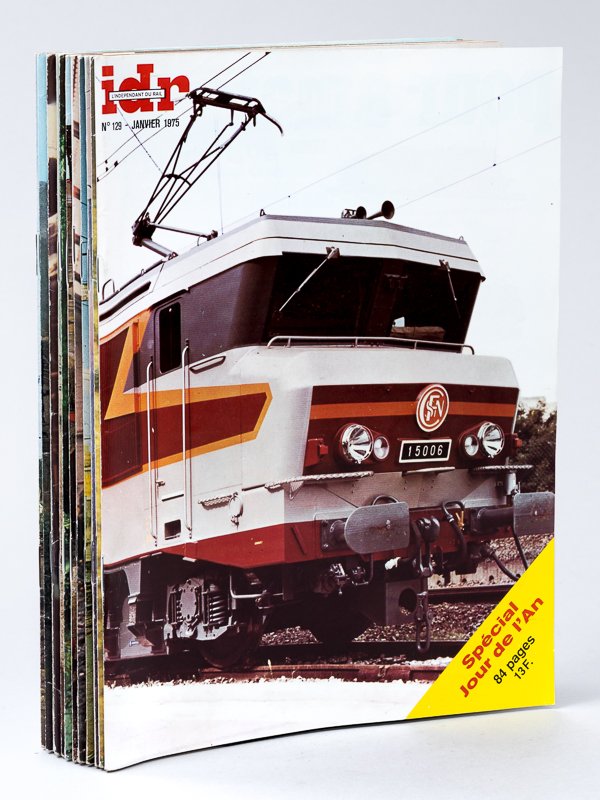 12 vol. in-4 br., couv. ill. couleurs, ill. noir et blanc ou couleurs, L'Indépendant du Rail, 1975, 767 pp. au total. Au sommaire notamment : 85 fois le tour de la Terre avec les wagons-lits ; Les chemins de fer et les ports français ; Les tribulations d'ue ligne présidentielle 1884-1938 (Dole-Poligny) ; Evolution des locomotives marchandises du PLM de 1854 à 1932 ; Petite histoire de la Draisine ; les locomotives vapeur de l'Alsace-Lorraine ; Les nouvelles rames RABD 8/16 des CFF pour le service banlieue ; Les chemins de fer de la Provence (Nice-Digne) ; Les locomotives tender de l'Alsace-lorraine ; Les chemins de fer de Corse ; Les autorails à hélice ; numéro spécial Chapelon (n° 137) ; La vallée du Rabodeau ; Les ateliers étrangers de la CIWL ; Les 141 P SNCF type Mikado ; Marseille contre ligne du Saint-Gothard. Très bon état pour cette année complète. Ensemble peu courant. L'Indépendant du Rail, ou l'IDR, était une revue de modélisme ferroviaire parue de 1963 à 1990. Son fondateur, Louis Lavignes, participa également à la création de la CPMR (Compagnie Privée du Modèle Réduit) et du magasin puis producteur de modèles réduit RMA (pour "Réseau Miniature Amateur"). L'IDR paraissait initialement comme "Bulletin confidentiel mensuel, Organe de liaison C.P.M.R. et R.M.A." Poids de 1,9 Kg