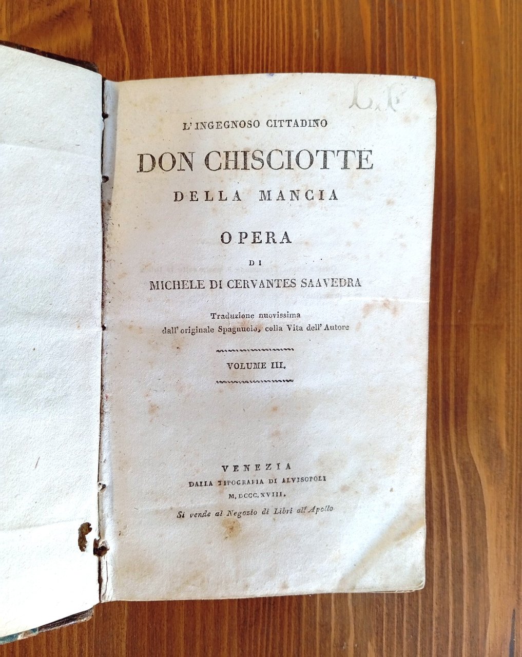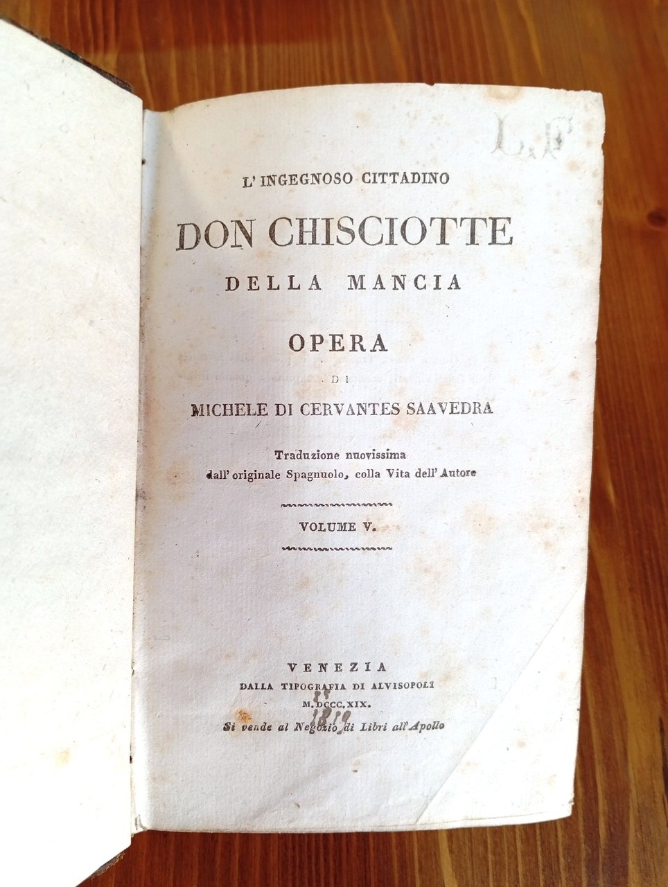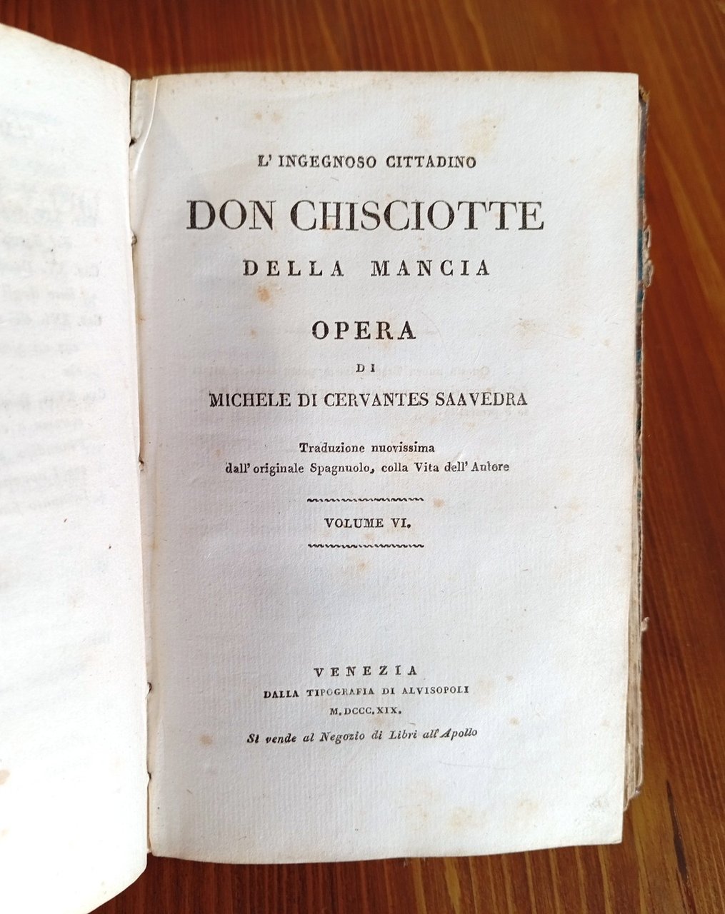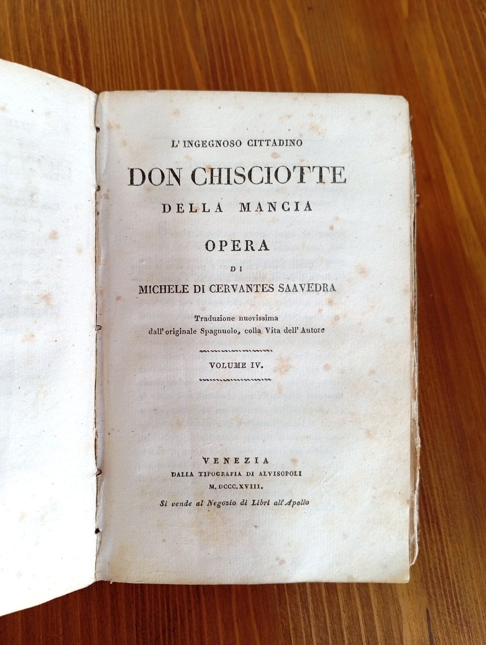 Volumi da III a VI, di otto complessivi, della rara seconda traduzione italiana del Don Chisciotte, a opera di Bartolomeo Gamba; edizione veneziana pubblicata tra il 1818 e il 1819 e venduta "al negozio di libri all'Apollo" - Quattro volumi riuniti in due tomi (9,5 x 15,5 cm circa) rilegati in mezza pelle, titoli in oro ai dorsi, pp. 247 + 239 / 243 + 278; non è presente nessuna delle tavole incise da Francesco Novelli (1767-1836). Etichette di ex libris alle sguardie, ordinari segni d'uso e del tempo; testo ben leggibile e legature salde; nel complesso buon esemplare di un'edizione assai rara, ancorché scompleta.