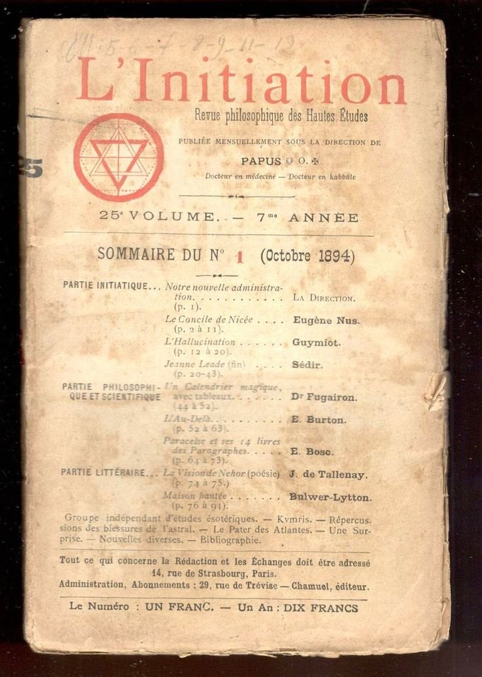 L'Initiation. Revue philosophique des Hautes Études. Publiée mensuellement sous la direction de Papus. 25e volume. 7me année. N. 1 (Octobre 1894)