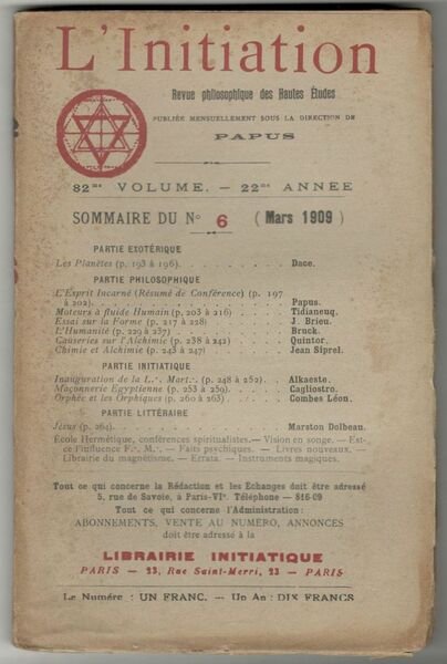 L'Initiation. Revue philosophique des Hautes Études. Publiée mensuellement sous la direction de Papus. 82me volume. 22me année. N. 6 (Mars 1909)