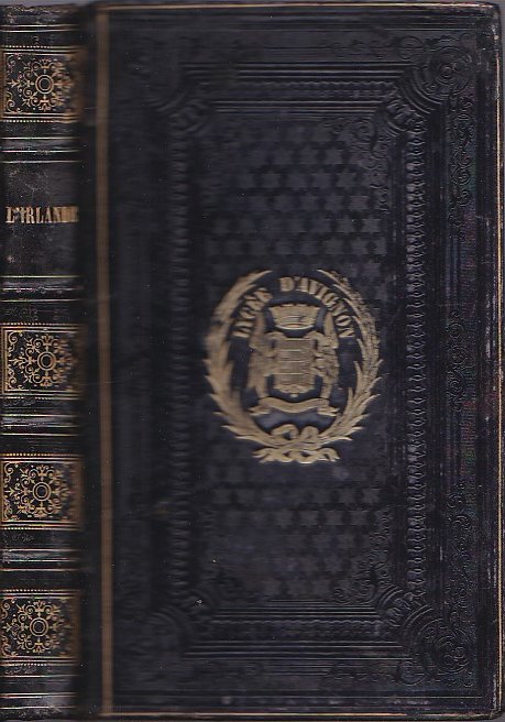 In-8°, pp. XII, 388, legatura coeva in piena pelle marrone impressa a freddo. Super libros in oro del Liceo di Avignone al centro del piatto anteriore entro fregi e ricche bordure impresse a freddo (stelle cosparse a seminato, filettature polilobate, motivi ornamentali vari), a loro volta inquadrate da un filetto perimetrale dorato. Titolo, filetti e ricchi in oro al dorso. Tagli dorati, sguardie marmorizzate. Antiporta xilografica con scena di predicazione di San Patrizio, 3 altre tavv. xilografiche f.t. disegnate da vari artisti e incise da Girardet. Etichetta in data 1859 di conferimento del volume in premio scolastico (etichetta a stampa con intestazione del Lycée Impérial d'Avignon, con integrazioni manoscritte da parte del provveditore agli studi De Sales attestanti il dono del volume come premio di ginnastica). Qualche fioritura sporadica, alcuni minimali rinfreschi alla legatura. Ottimo esemplare. Edizione originale. Graziosa opera divulgativa sulla geografia e la storia dell'Irlanda, sino alla condizione politica dell'isola nel corso del secolo decimonono. In appendice, 'pièces justificatives', estratti dell'orazione funebre dell'O'Connell pronunziata in San Pietro dal padre Ventura e cenni sulla lingua e la letteratura irlandese.