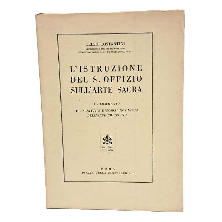PRIMA EDIZIONE Trattato sull'arte e di come essa debba essere impiegata per le materie sacre. Il libro analizza e commenta le direttive della Chiesa cattolica sull'arte, definendo i criteri per l'arte sacra, basandosi su tradizioni iconografiche e sul legame tra teologia e arte. Si tratta di un commento approfondito sull'Istruzione del Sant'Uffizio riguardo all'arte sacra, probabilmente in risposta al dibattito tra arte moderna e tradizionale nella chiesa. Con imprimatur. Opera rara. Brossura. Pp. 231. Con tavole in bianco e nero fuori testo. Ottime condizioni.