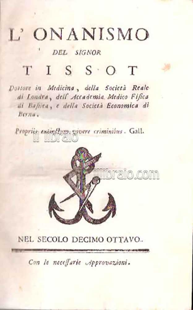 2 tomi in un unico vol.; in 16°; pp. XIV, (2), 264 - 57 (7); leg. con dorso in mezza pelle con angoli, piatti marmorizzati, dorso con fregi. Marca tipografica al frontespizio. A seguito della prima opera si trova il trattato "Della tabe dorsale", scritto da un anonimo, che è spesso allegato, perchè correlato, all'Onanismo del sig. Tissot ed alla Ninfomania del sig. Bienville