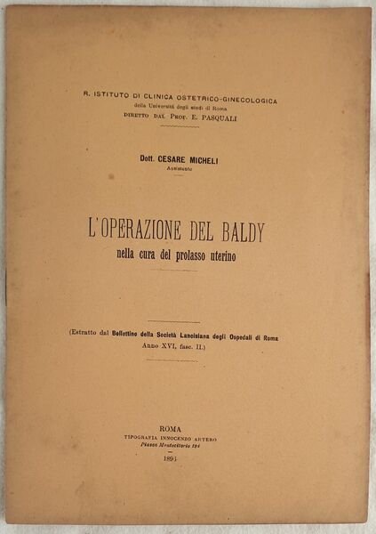 Pubblicazione del 1896 sull'operazione del Baldy nella cura del prolasso uterino scritta da Cesare Micheli. Estratto dalla Rassegna d'Ostetricia e Ginecologia 1896. In ottime condizioni. Brossura editoriale in buone condizioni generali con lievi usure ai margini e dorso. Legatura in buone condizioni. Pagine in buone condizioni con fioriture. In 8 cm. 24x17. Pp. 12