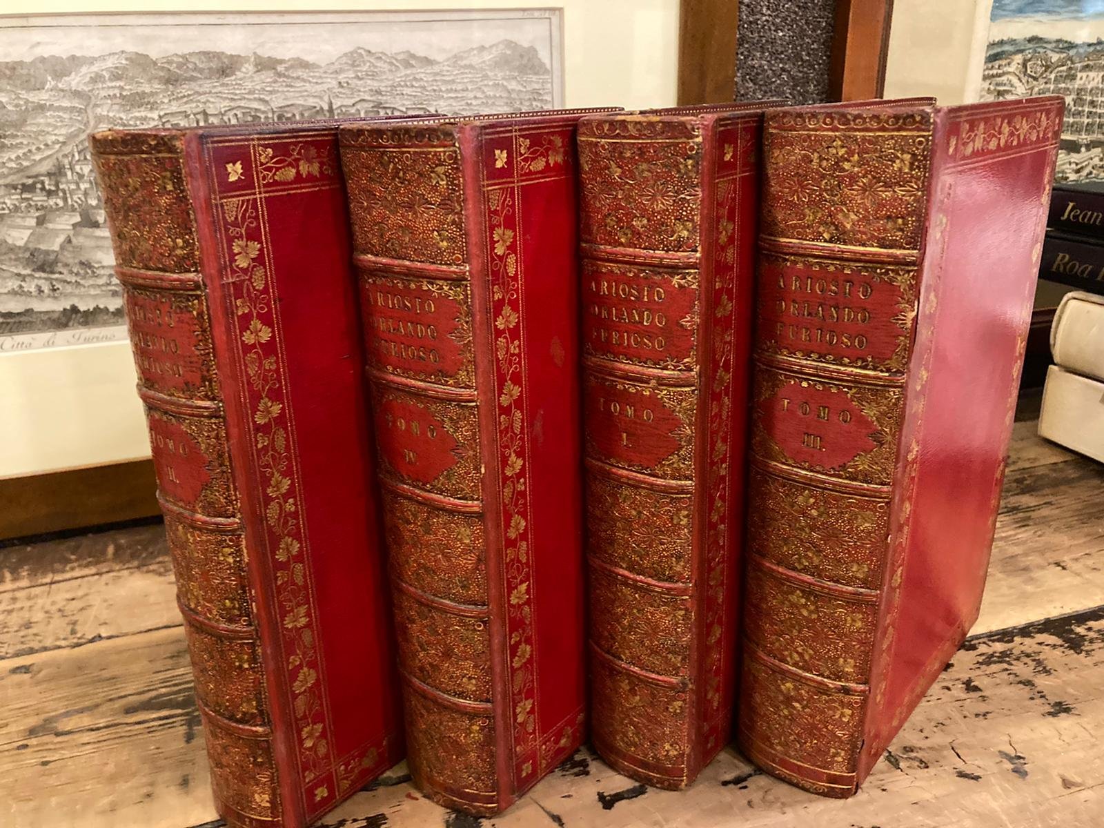 4 volumi in-8° (23.5x15.5 cm), elegante legatura rigida coeva in piena pelle rossa con titoli e fregi fitomorfi al dorso, piatti riquadrati con doppio filetto dorato racchiudenti tralci di vite e pampini e grappoli d'uva, tutti i tagli dorati, contropiatti in carta figurata. Pp (1), XVI, XXXIV, 390 all'antiporta ritratto di Ariosto inciso in rame (Luigi Mazzi); 491, (1); 517, (1); 483, (1). Ex libris inglesi applicati ai contropiatti anteriori. Più che buon esemplare. Pregevole edizione nitidamente stampata arricchita dagli argomenti in forma di ottava di Scipione Ammirato e da note in appendice ad ogni tomo condotta dal Molini sull'edizione del Morali (Milano 1818) il quale attinse direttamente a quella di Ferrara del 1532 . Cfr. Graesse, I, 200; Brunet, I, 439: 'Edition assez precieuse parce qu'elle est la plus complete sous le rapport des choses ajoutees'. Gamba, 64n.: 'Il testo del 1532 si adotto' in fatto principalmente dai diligenti uomini Giuseppe Molini (e Angelo Sicca) per le sue eleganti ristampe del Furioso'.