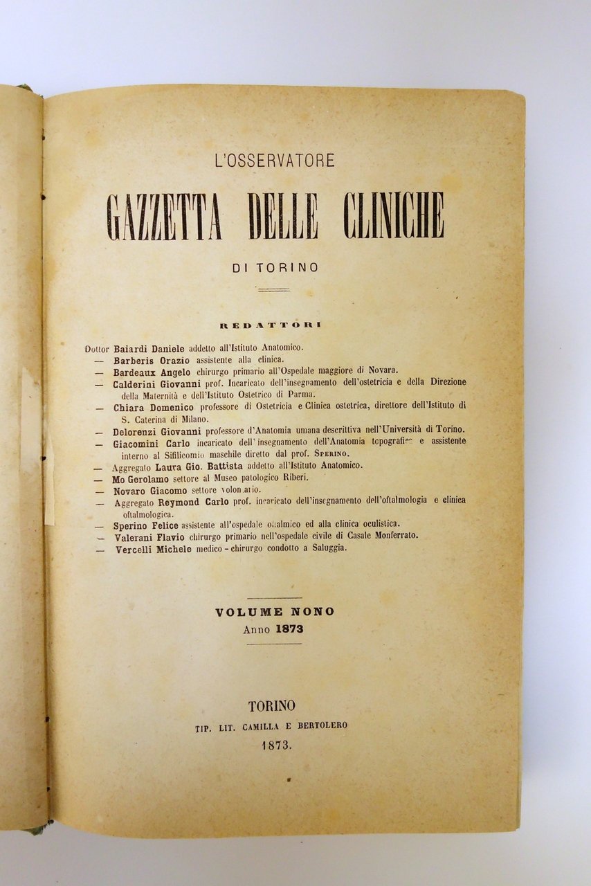 Tip. Lit. Camilla e Bertolero, Torino, 1873; cm 23,5x15,5; pp. 840-32 (numeri autonomi, con numerazione progressiva annuale; ciascun numero è di circa 16 pagine). 52 numeri di rivista, rilegati entro volume in cartonato ed. con titolo al dorso e al piatto ant. Alle ultime 32 pagine accluso il supplemento - pubblicazione Ospedale di Vercelli / Avvertenze cliniche sulla pneumonite e sulle sue varietà nei luoghi palustri, del dottore Carlo Pisani.