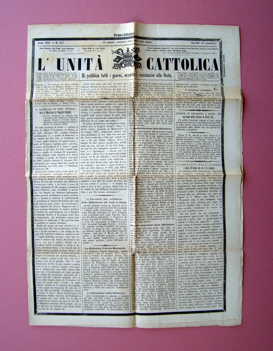 Periodico, L'Unità Cattolica" Anno 1880 - N. 217 Giovedì, 16 settembre "I nuovi casi di Rimini" Tip. Stefano Marino, Torino,1880; cm 49,5x35, pp. 4 (bifolio); in ultima alcune inserzioni pubblicitarie dell'epoca. Numero completo. Condizioni di conservazione Esemplare in buone condizioni con tracce d'uso e del tempo, pieghe di conservazione che si presentano leggernente ingiallite con strappetti e piccolissime mancanse, pochi minuscoli strappetti ai margini, per le condizioni vedi foto. Dal 1845 ad oggi. Si parla dell'uccisione di un soldato (Luigi Berti) assasinato con 14 pugnalate dai settari repubblicani Numero completo. SETT45.L21518 blu "