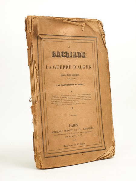 3e éd., 1 vol. in-8 br., Ambroise Dupont et Cie, Libraires, Paris, 1827, 96 pp. Etat moyen (ouvrage débroché et écorné, intérieur propre). Prix en l'état. Ouvrage inspiré par la crise entre la France et le dey d'Alger, causée par l'affaire Nathan-Bacry, ancien sujet algérien, nauralisé français, dont le dey réclamait l'extradition pour des dettes relatives à des ventes de blé algérien, pendant la Révolution. Un prélude à la conquête de l'Algérie.