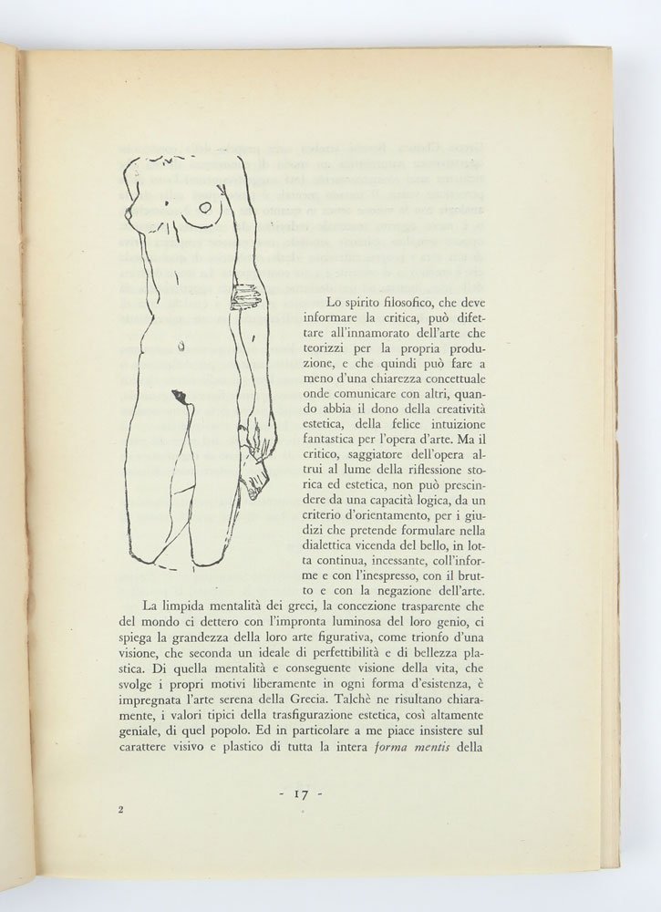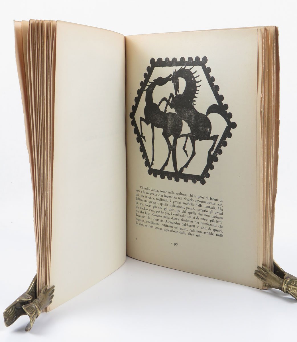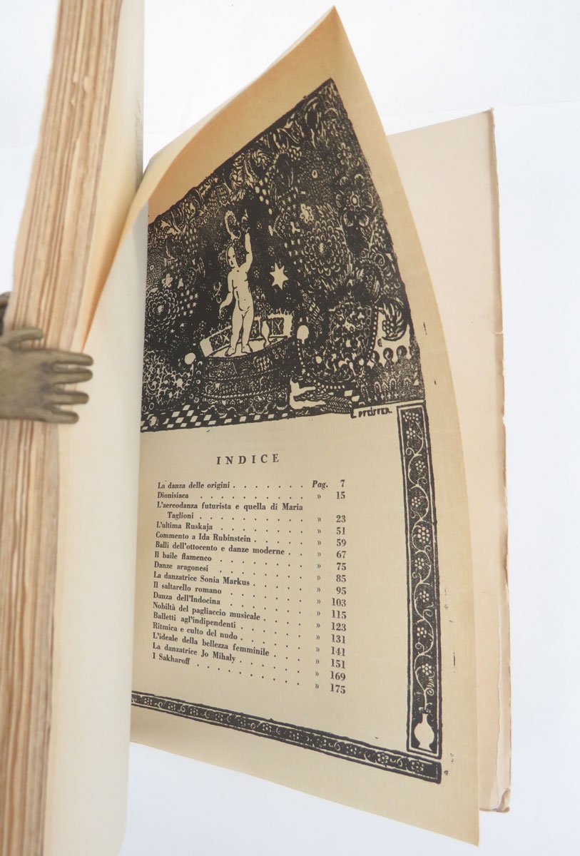 LIBROPrima edizione.Ottimo esemplare a fogli chiusi (lieve brunitura e minime abrasioni tra dorso e cerniere): raro così.Bel volume in elegante formato e corredato da sorprendenti illustrazioni (per lo più non firmate, ma una di Massimo Campigli, si riconosce un nudo di Schiele.), raccoglie una serie di interventi dell’autore sulla danza femminile: dopo un breve excursus storico, l’attenzione è subito alla danza contemporanea, l’aerodanza futurista, Ida Rubinstein, Ruskaja, Jo Mihaly, Sakharoff.