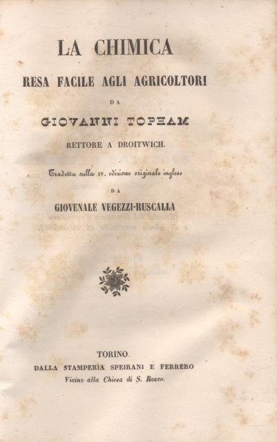 LA CHIMICA RESA FACILE AGLI AGRICOLTORI. Tradotta sulla IV edizione originale inglese da Giovenale Vegezzi Ruscalla. 1846 circa.