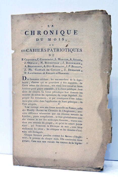 4 pages. (23x14,5 Cm). Broché. Rarissime prospectus de parution de ce célèbre périodique paru entre 1791 et 1793. On y trouve la philosophie de la publication, la rubrique assurée par chaque auteur, les conditions d'abonnement, etc. Petits manques. Taches et rousseurs.